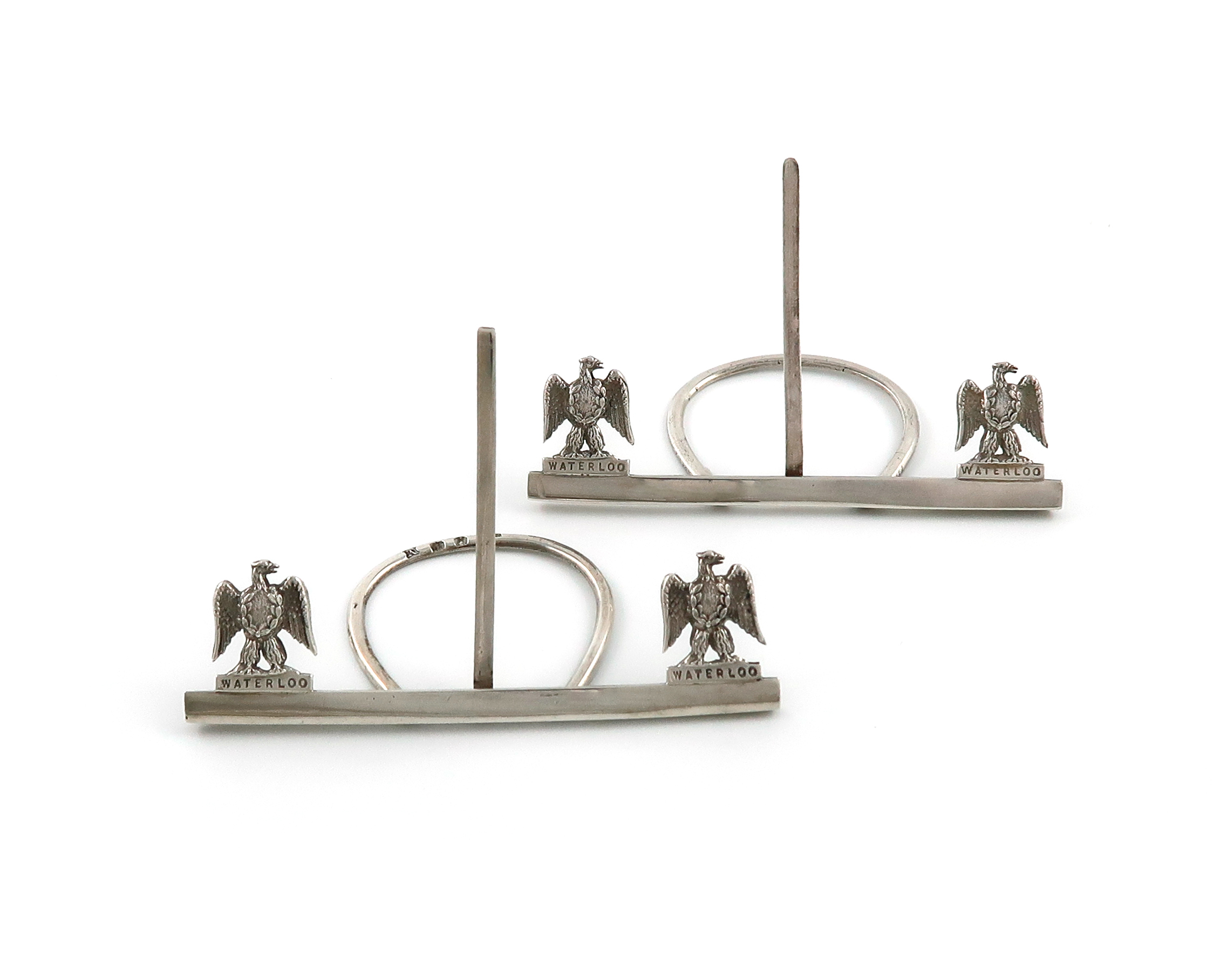 modelled as two regimental badges above 'Waterloo', wirework support, length 9cm, approx. weight 1.2oz. (2)
