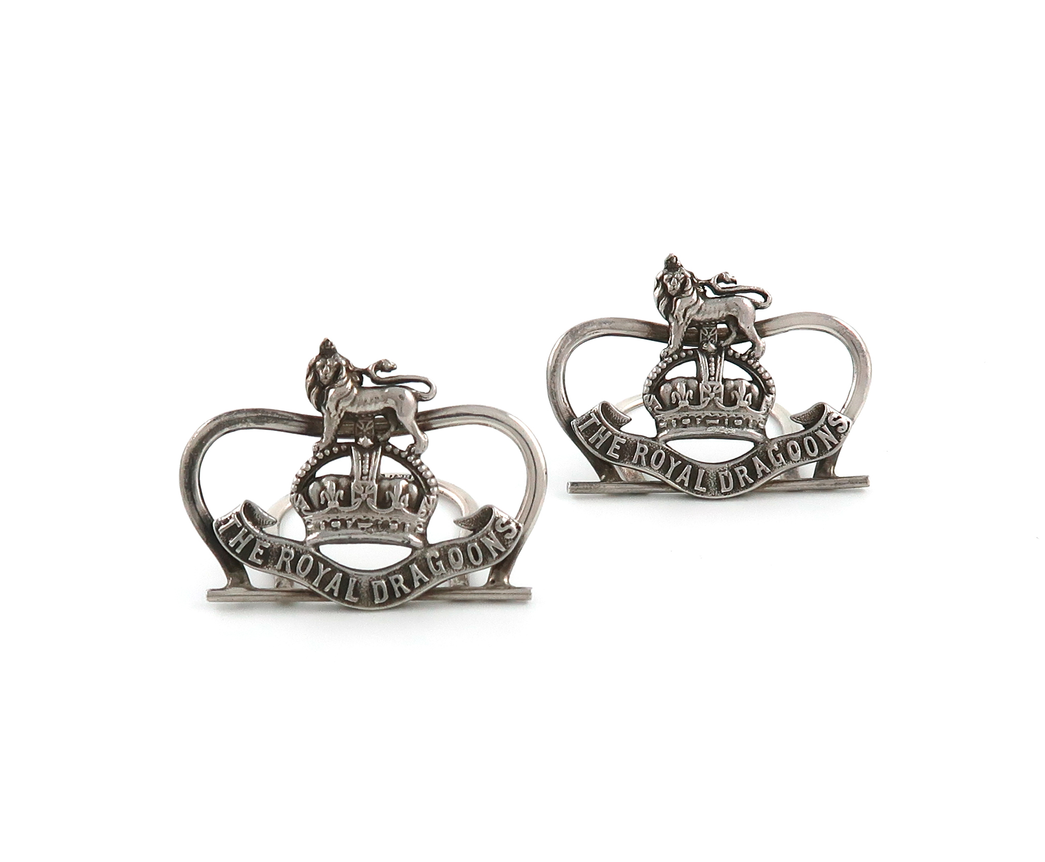 A pair of Scottish Regimental silver menu card holders, The Royal Dragoons,