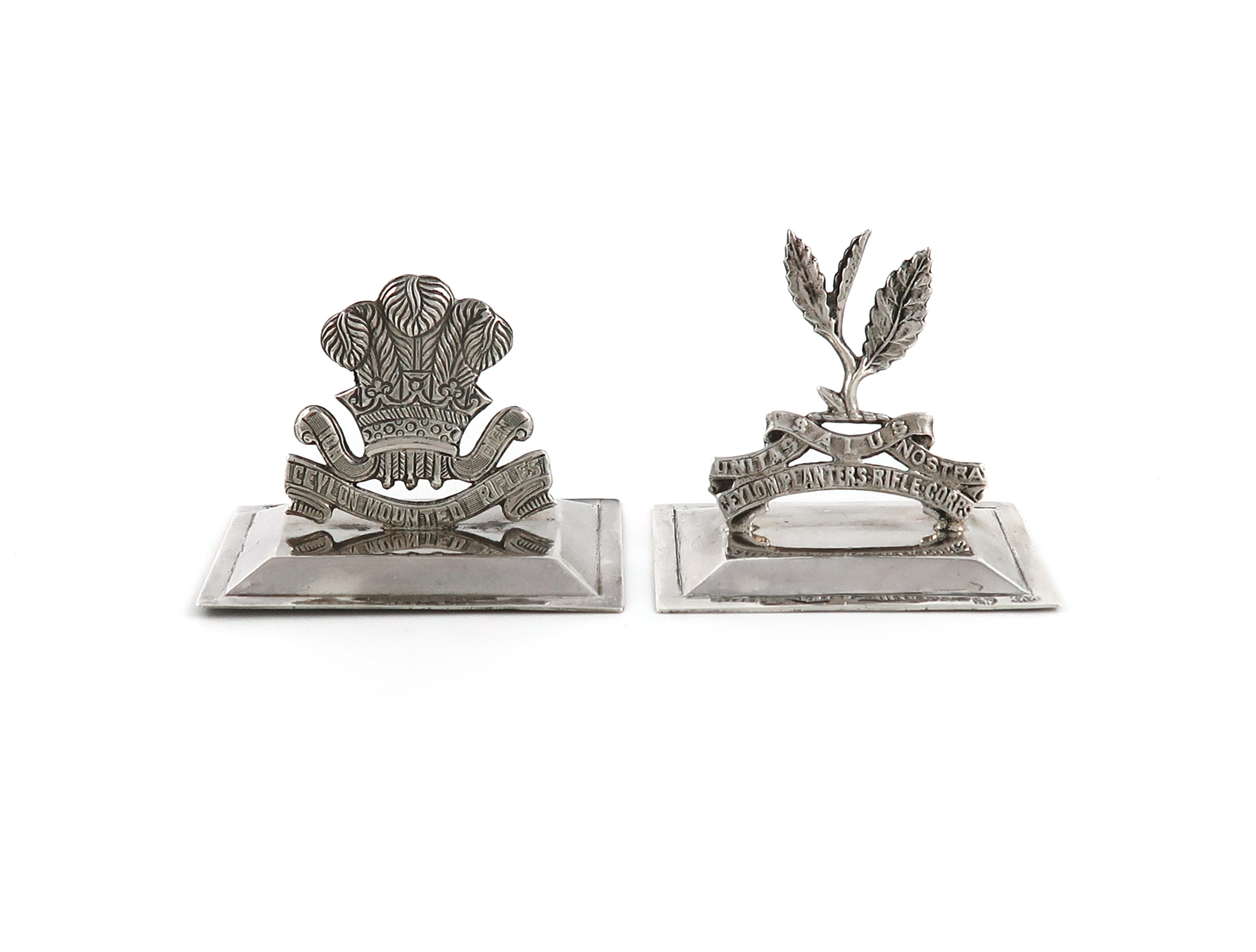 Two Regimental silver menu card holders, The Ceylon Planters' Rifle Corps and The Celyon Mounted Rifles,