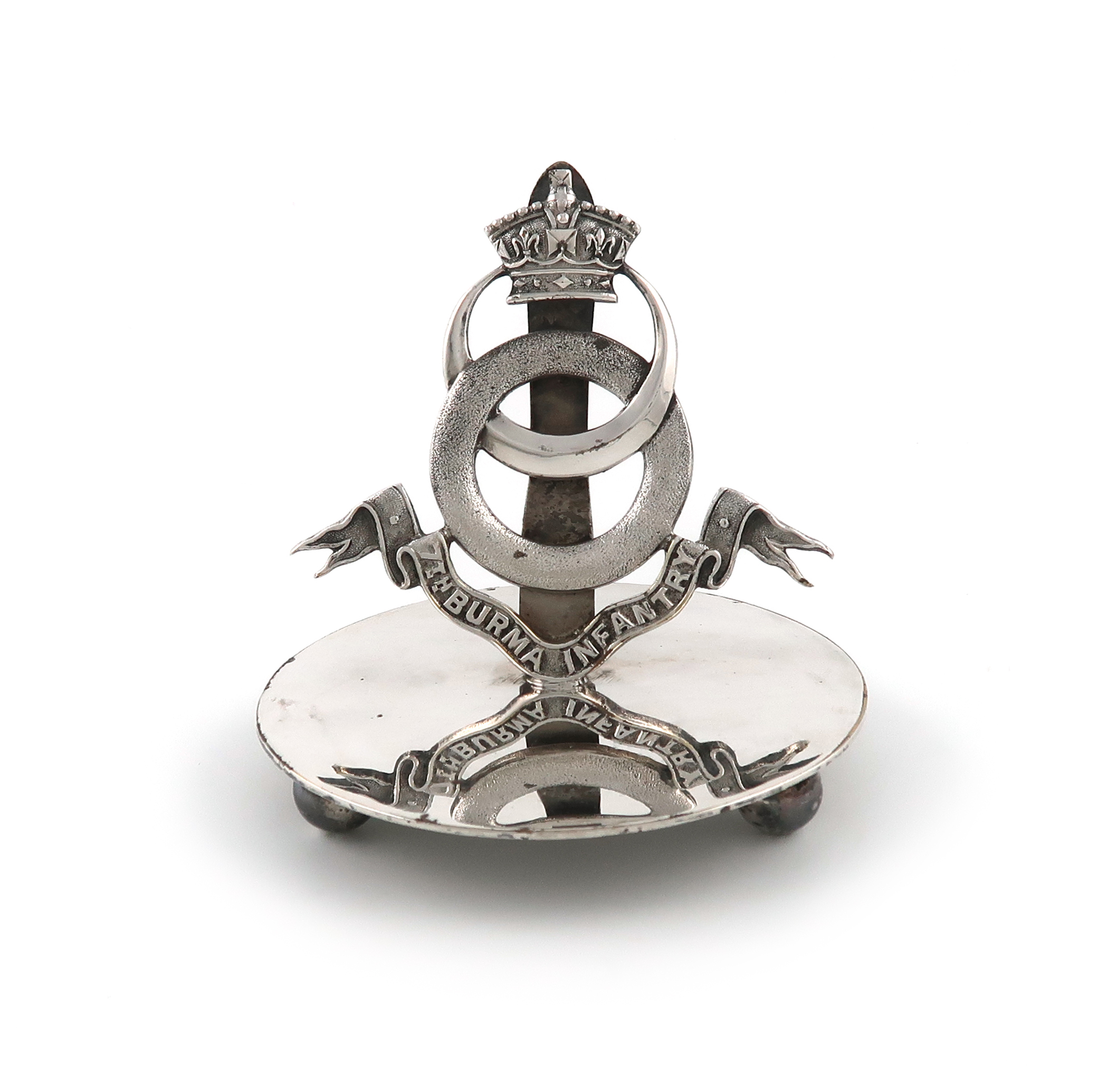 A late-Victorian Regimental electroplated menu card holder, The 29th Regiment (7th Burma Battalion) Madras Native Infantry,