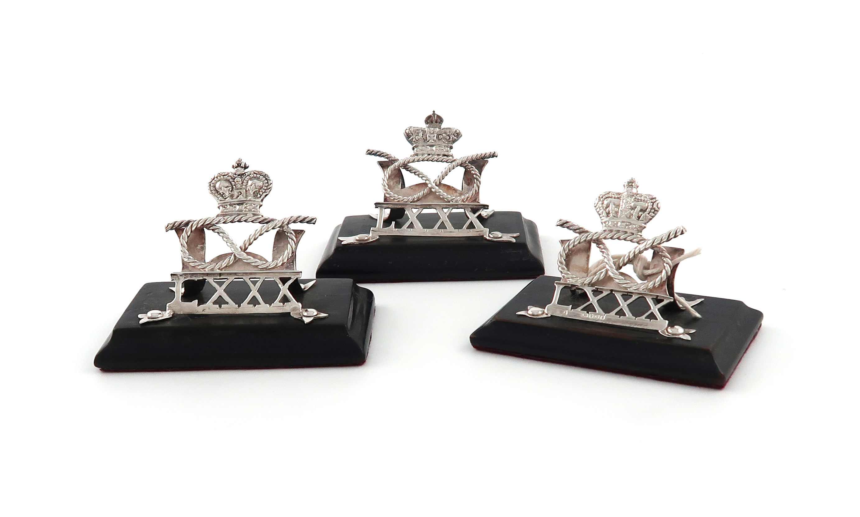modelled as the regimental badge, one with enamel decoration, mounted on wooden bases, length 9cm. (3)