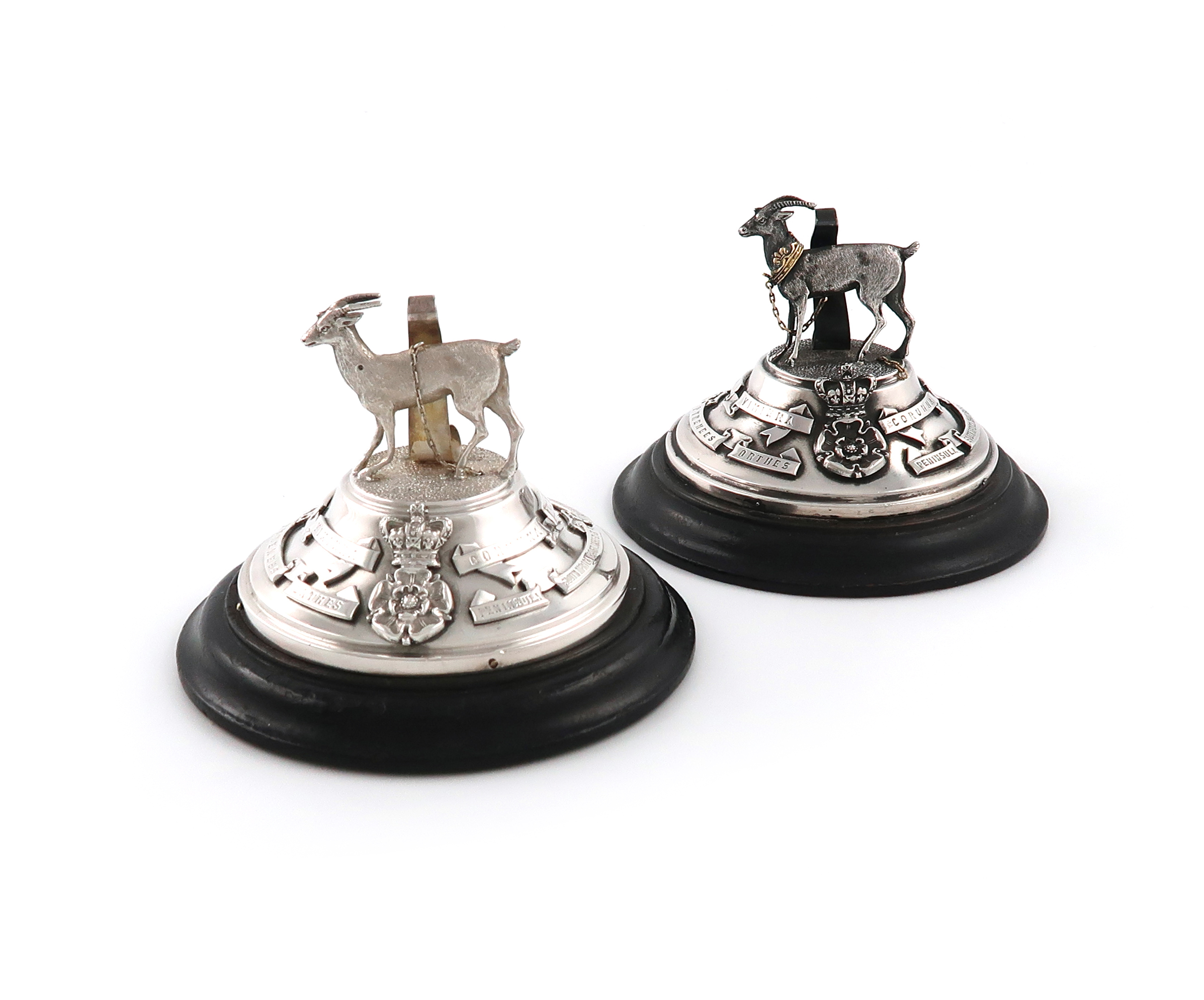 modelled as the regimental badge, one with a crown around its neck, on raised circular bases on wooden plinths, engraved 'H McC' for Harry McCalmont', height 7.2cm. (2)