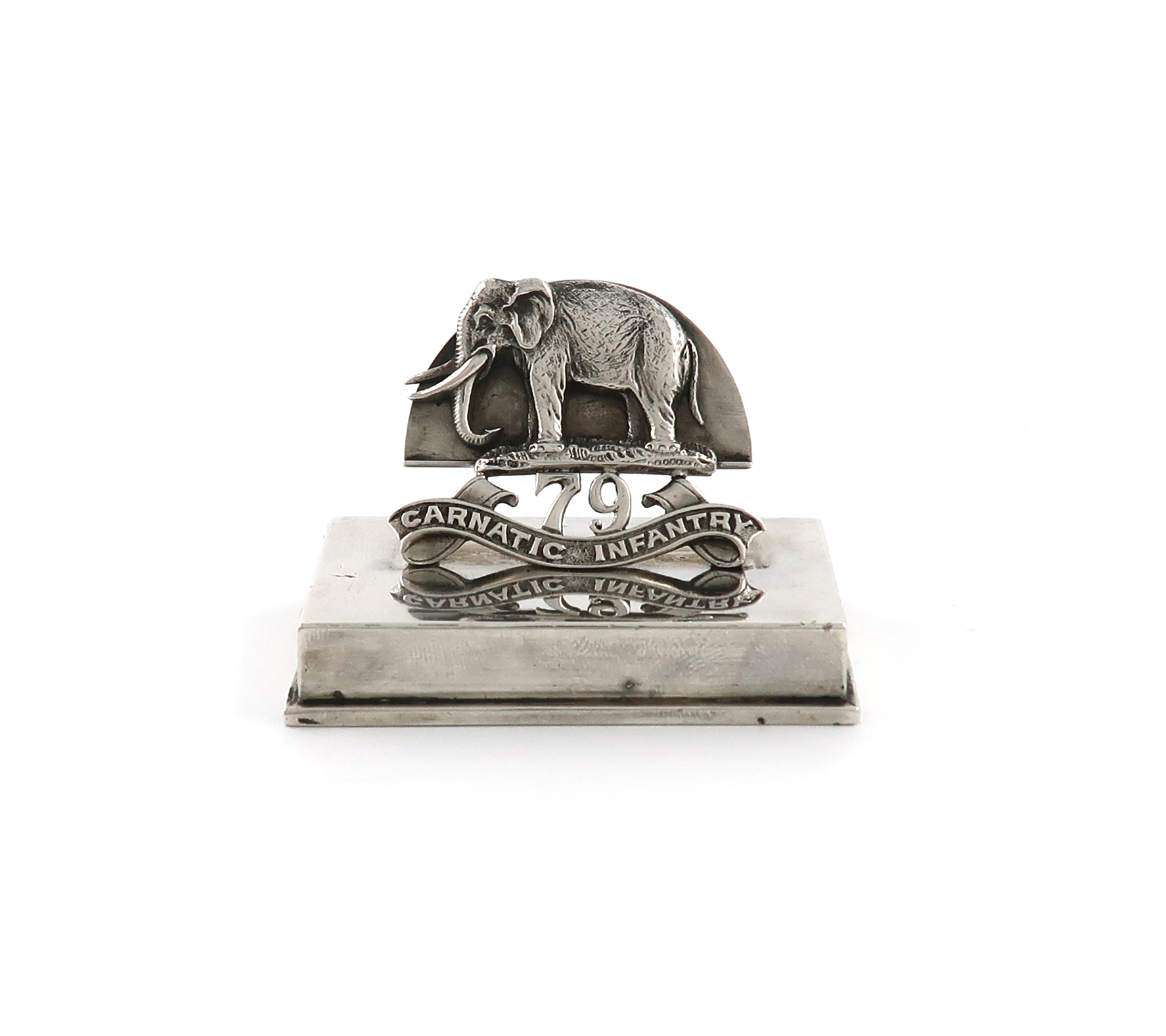 An Edwardian Regimental silver menu card holder, 79th Carnatic Infantry,