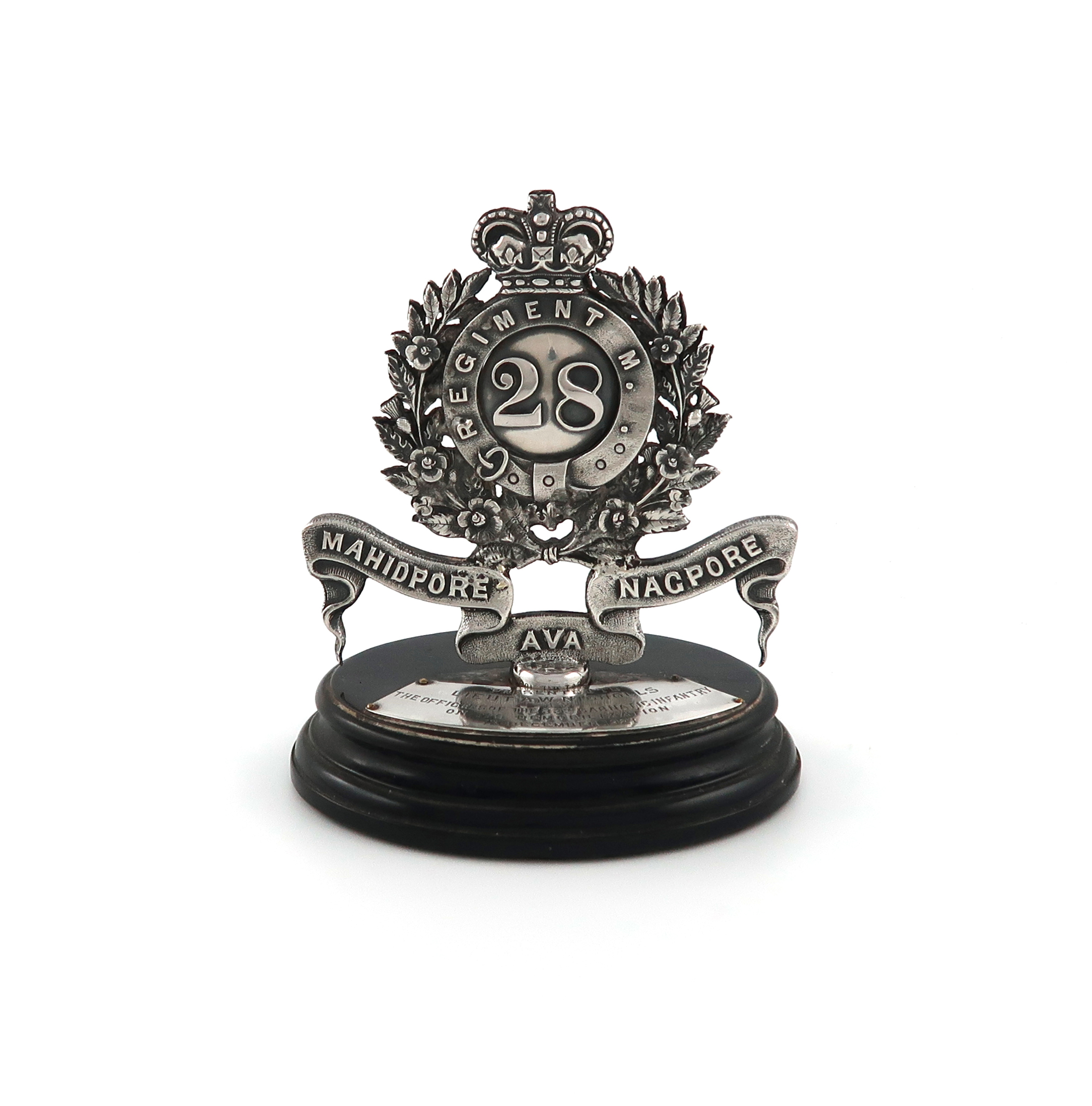 modelled as the regimental badge, mounted on a wooden base, with a plaque, inscribed 'Presented to Lieut A.W. Nicholls by the Officers of the 88th Carnatic Infantry on its Demobilization in December 1921', height 11cm.