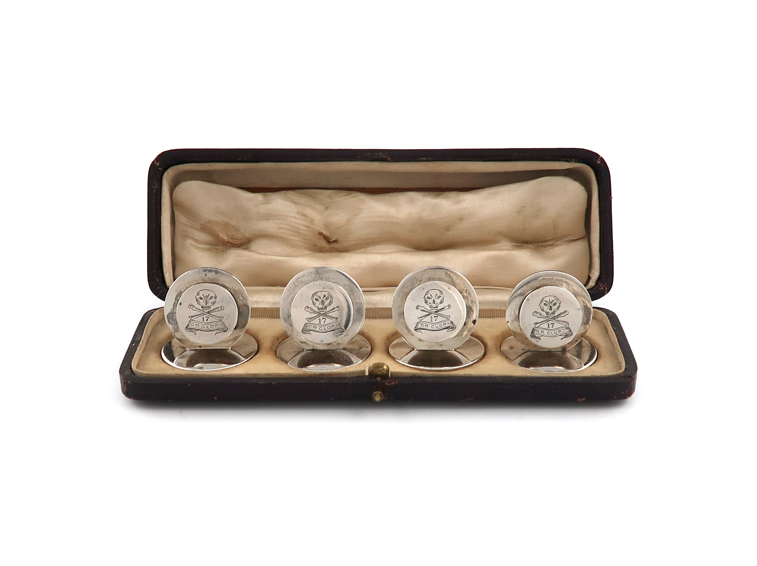 circular disc form, engraved with the regimental badge, on circular bases, in a fitted case, diameter of base 3.1cm, approx. weight 3.4oz. (4)