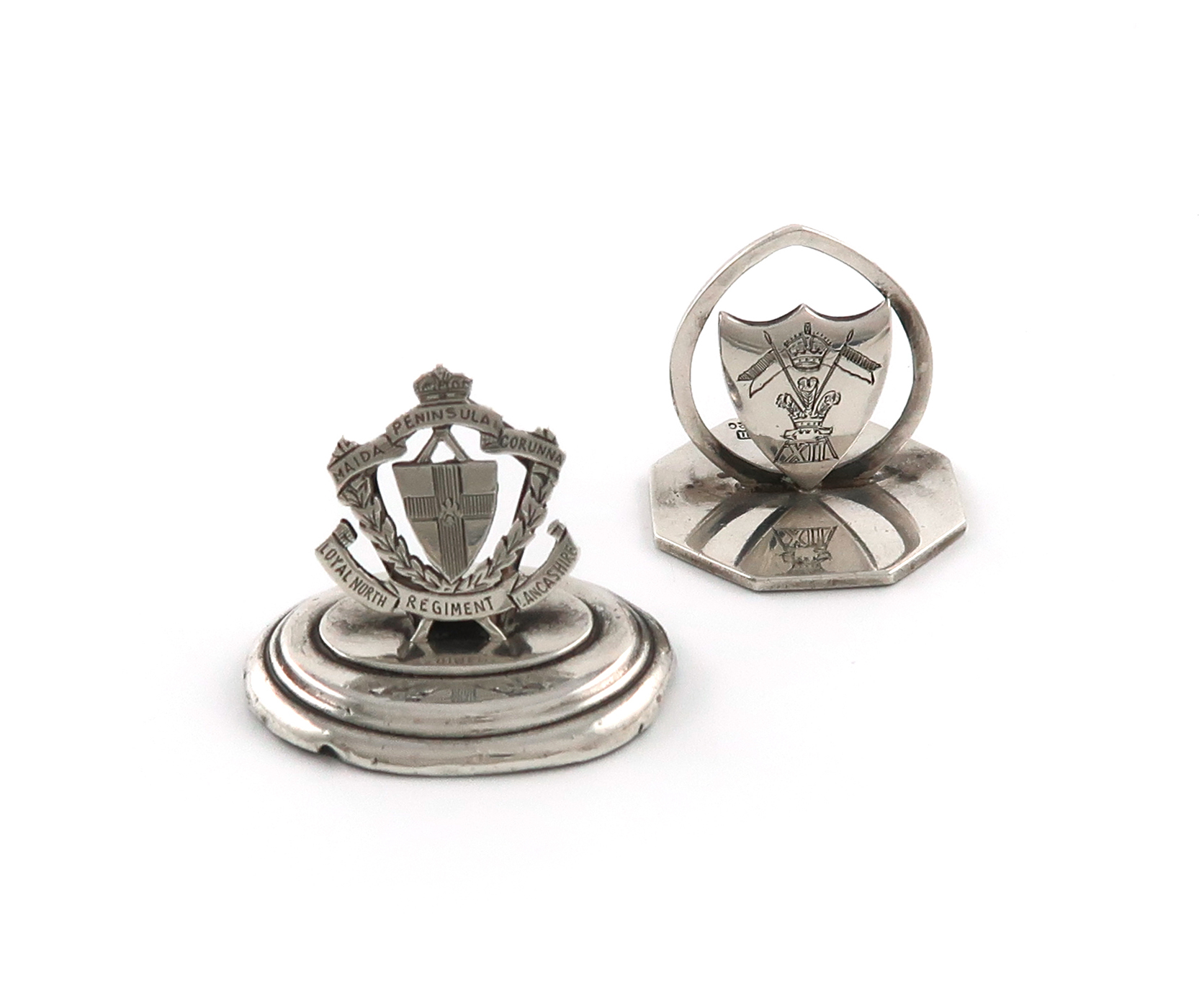 modelled as the regimental badge, on an octagonal base, plus an unmarked Regimental menu card holder, The Loyal North Lancashire Regiment, approx. weighable 0.7oz. (2)