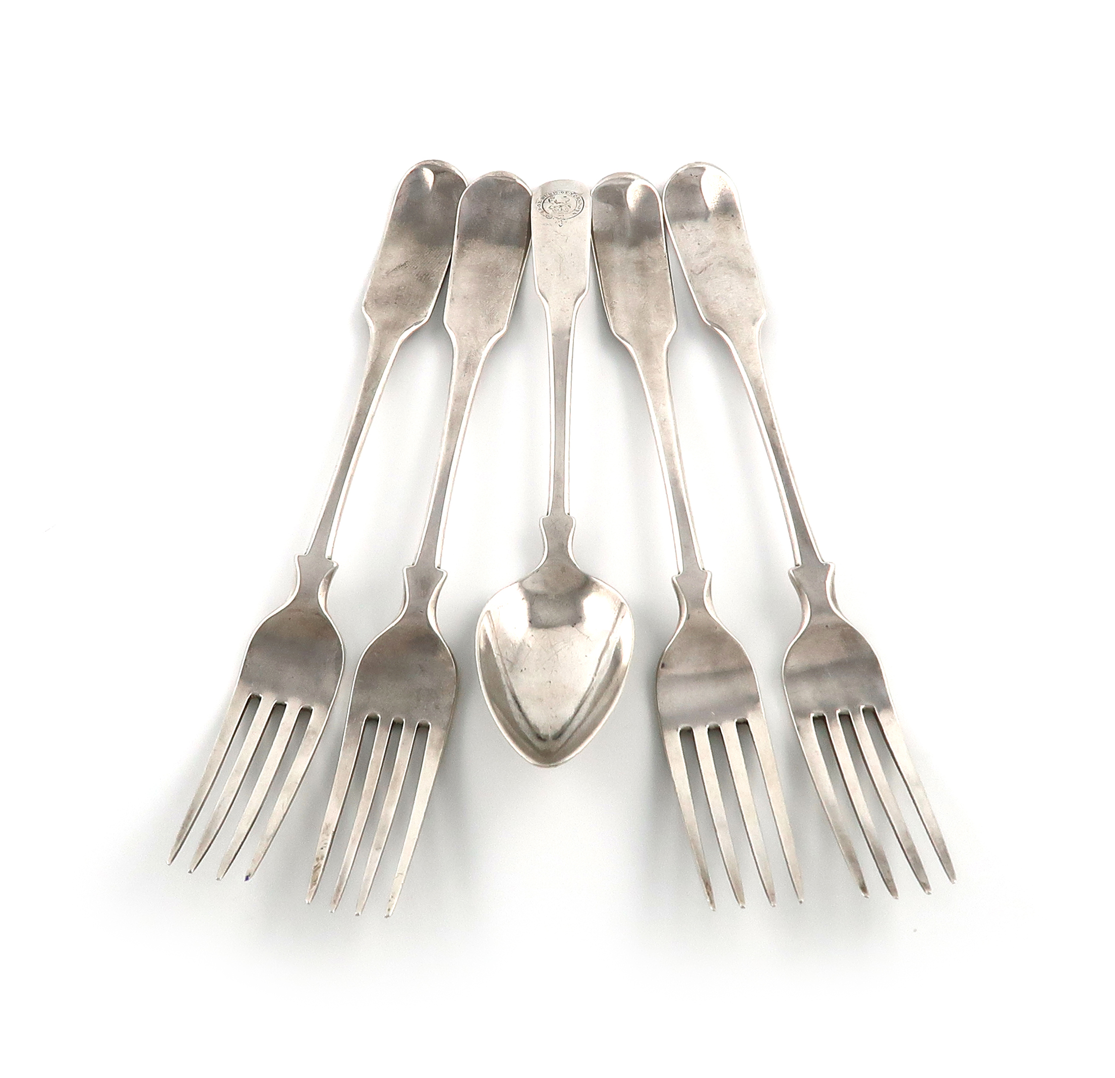 A set of four George III Scottish Regimental silver King's pattern table forks and a dessert spoon