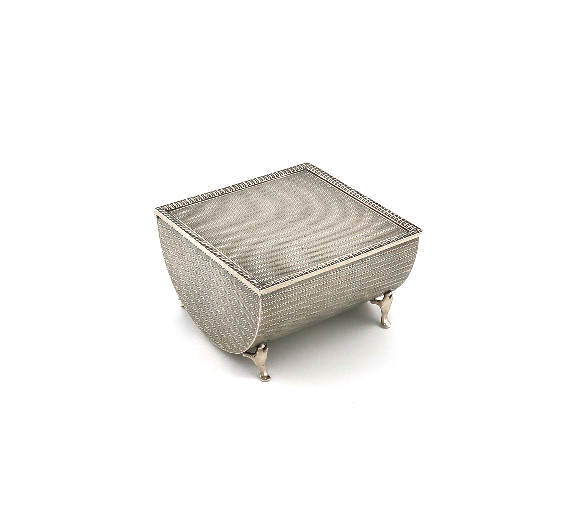 square and semi circular form, engine-turned decoration, gadroon border, wood lined, on four bracket feet, length 9cm.