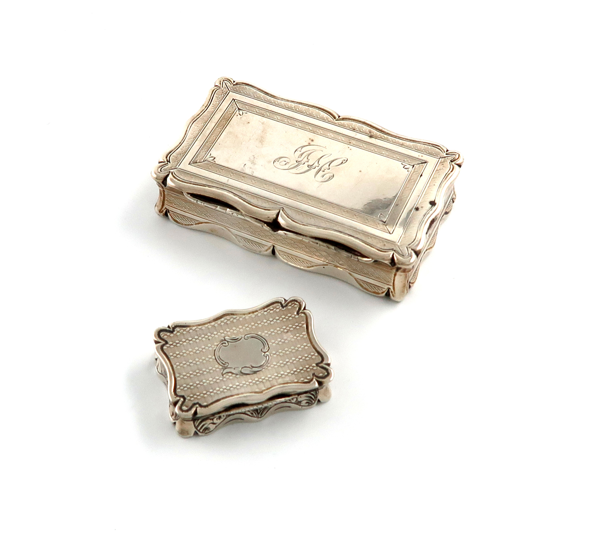 rectangular form, engine-turned borders, the cover initialled, plus a Victorian silver vinaigrette, by the same maker, Birmingham 1847, rectangular form, engine-turned decoration, with a vacant cartouche, the interior with a pierced foliate scroll grille, approx. total weight 3oz. (2)