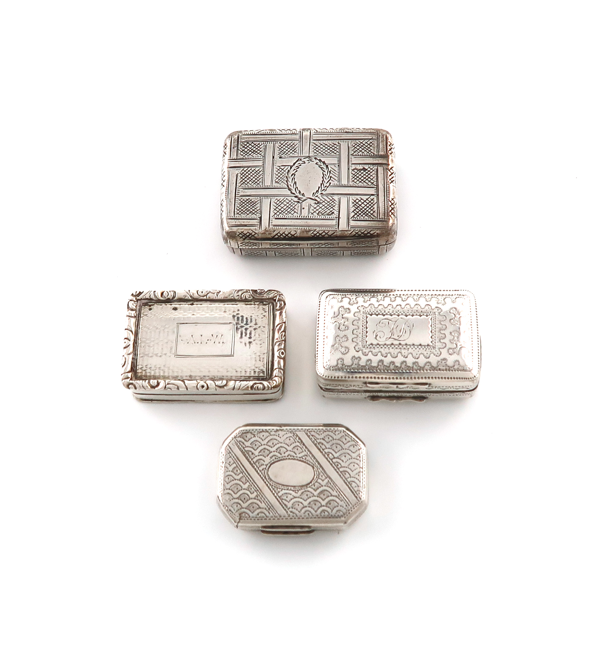 comprising: a George IV one, London 1823, rectangular form, with engraved trellis decoration, pierced and engraved foliate scroll grille, length 3.7cm, one by E. Smith, Birmingham 1841, one by Lea and Clarke, Birmingham 1813, and one other, grille a.f, approx. total weight 2oz. (4)