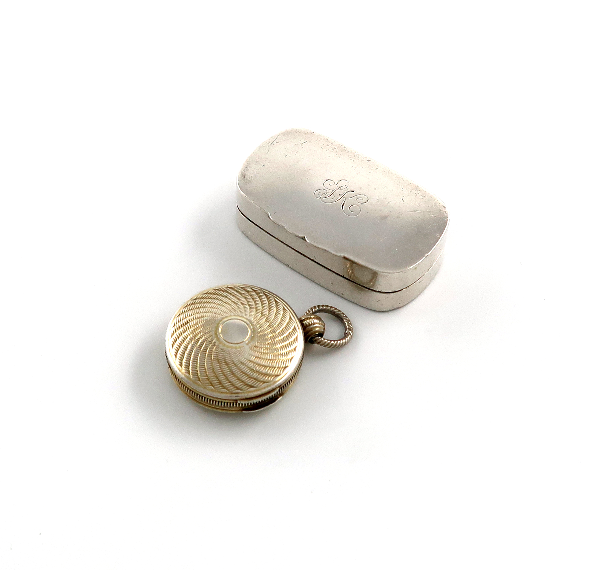 plain rounded rectangular form, the hinged cover initialled, the interior with a plain pierced silver-gilt grille, plus a George IV silver-gilt watch case vinaigrette, by Corfield and Co., Birmingham 1825, circular form, spiral engine-turned decoration, approx. total weight 1.1oz. (2)