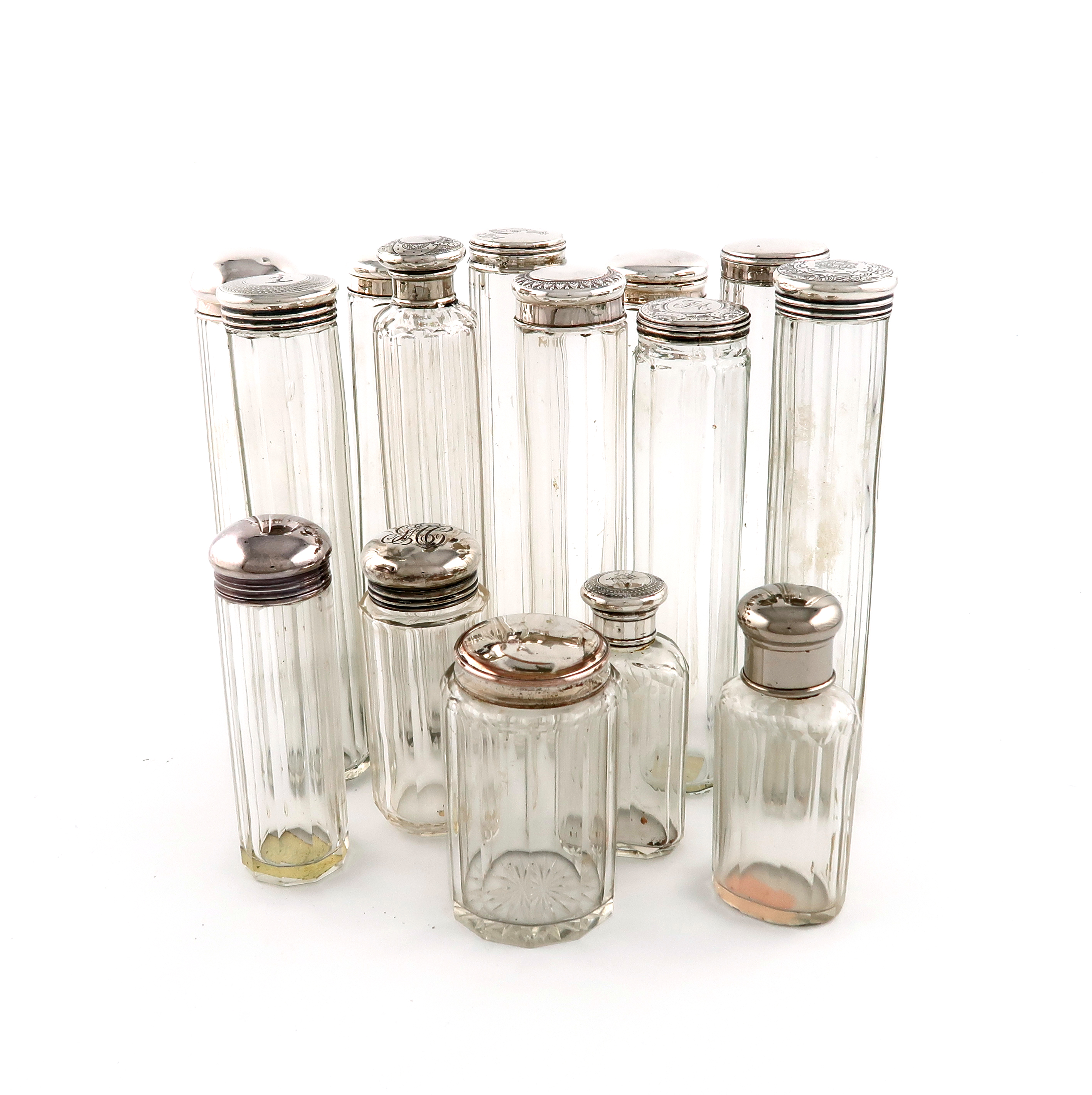 A collection of fifteen silver and electroplated mounted toilet jars and bottles,