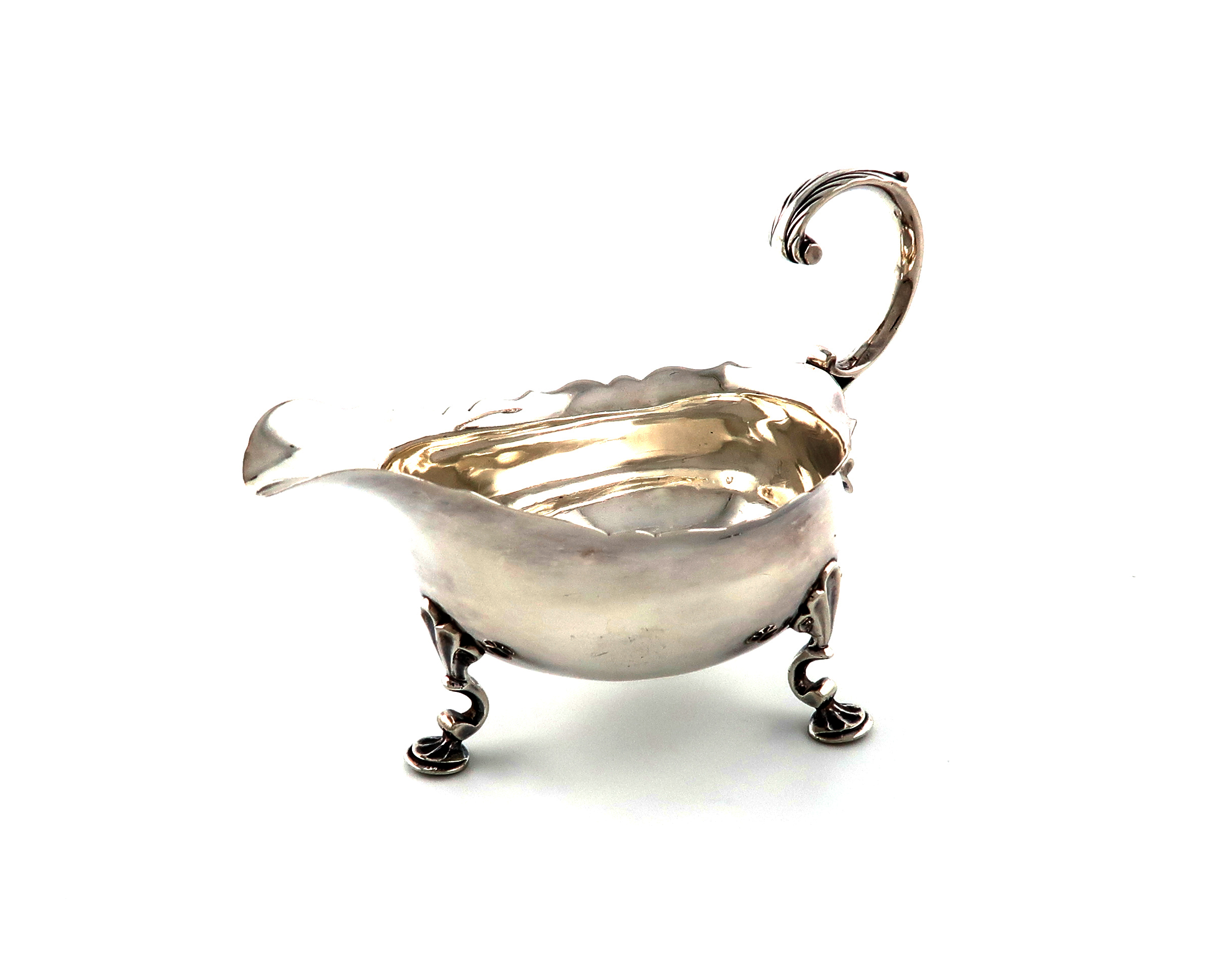 oval form, wavy-edge border, leaf capped scroll handle, on three scroll legs and pad feet, length 13.5cm, approx. weight 3.9oz.