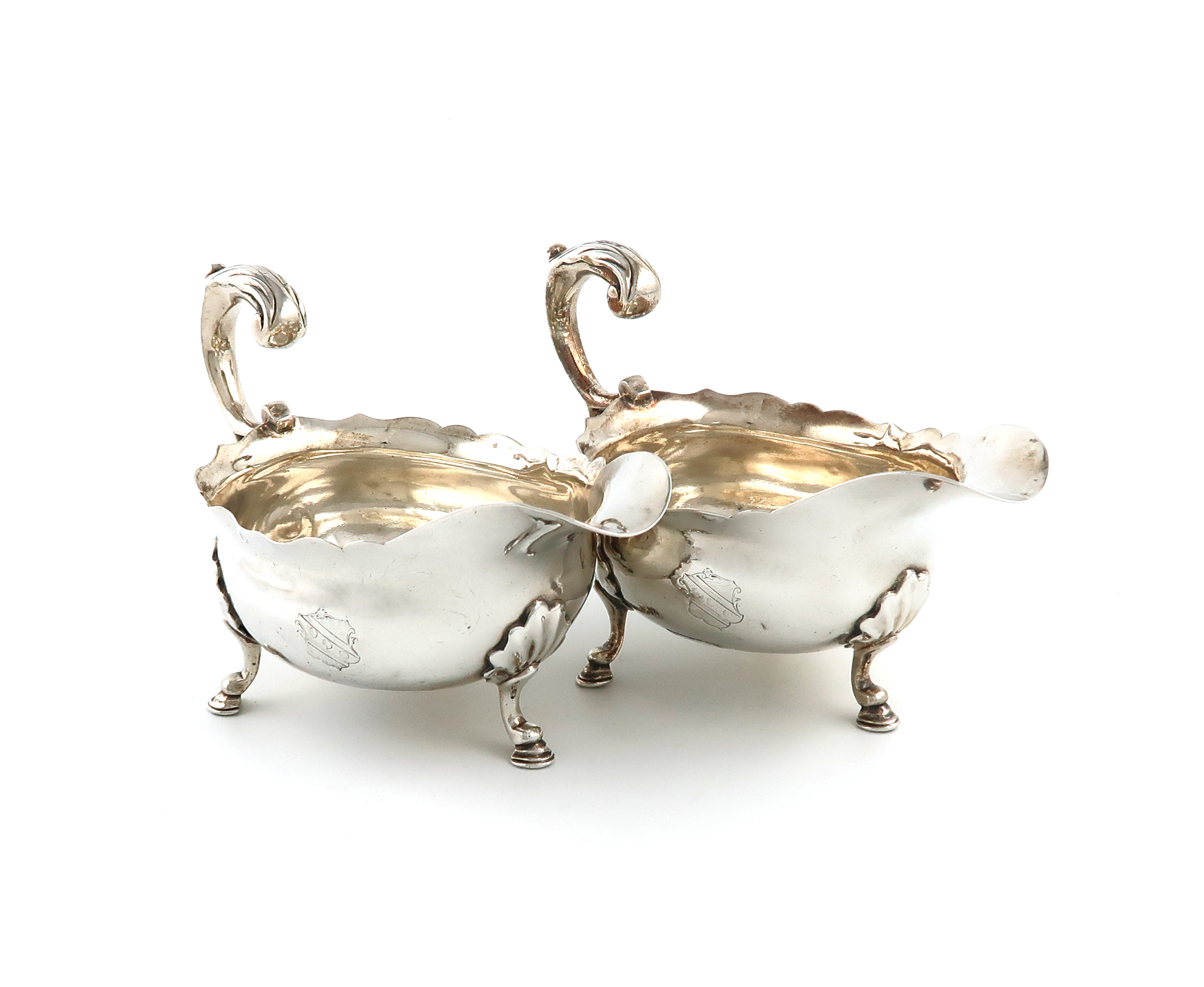oval form, wavy-edge border, leaf capped scroll handles, engraved with armorial shields, on three shell capped hoof feet, length 16.5cm, approx. weight 14.7oz. (2)