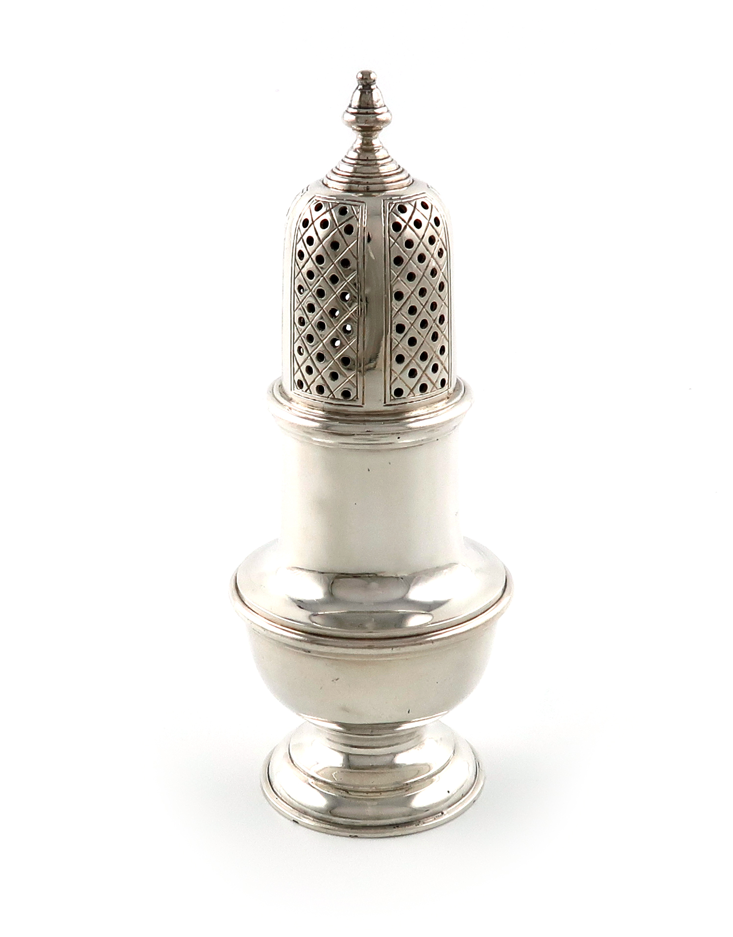 circular bellied form, pull-off pierced cover, on a raised circular foot, height 16.3cm, approx. weight 7.7oz.