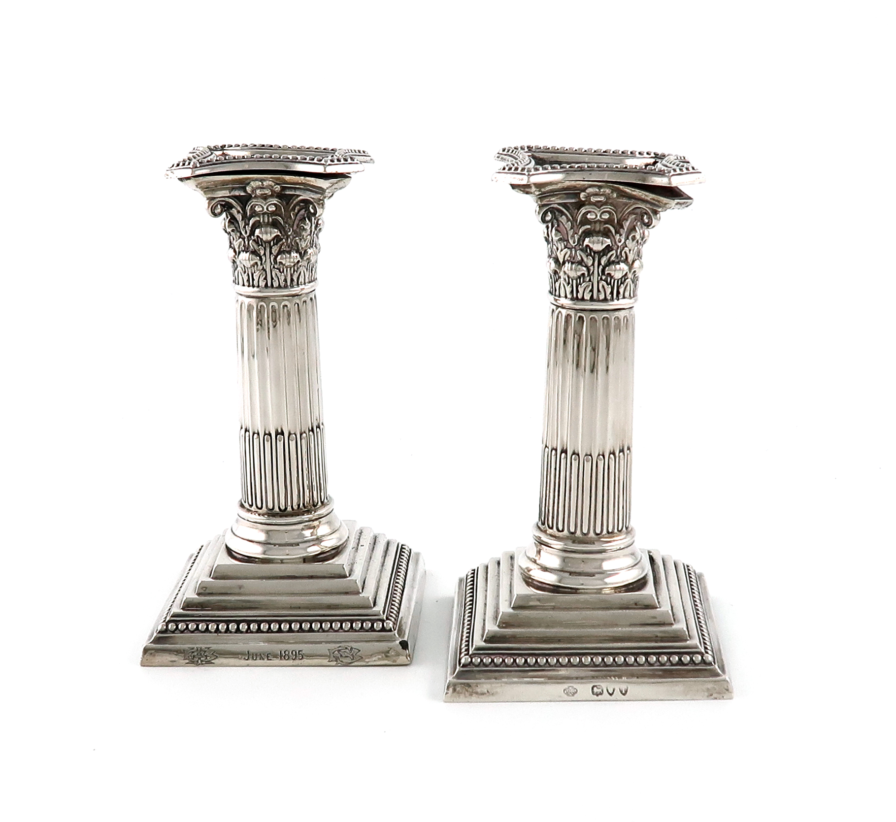 Corinthian column form, beaded borders, on a stepped square base, inscribed, heights 14.5cm and 15cm. (2)
