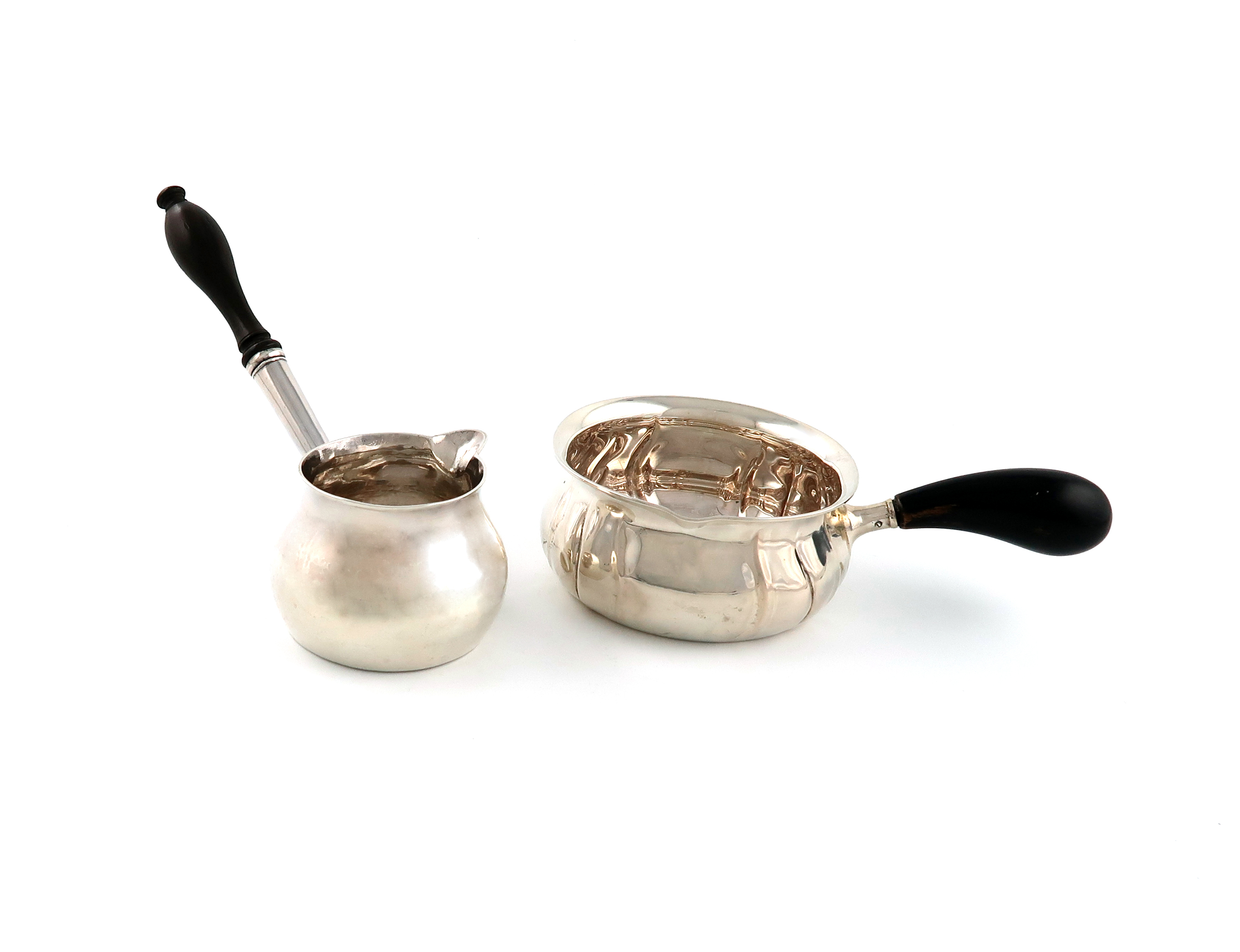 circular bellied form, with a turned wooden handle, length 15.2cm, approx. weight 2.8oz, plus a Danish silver brandy pan, Copenhagen 1949, assayer Johannes Siggaard, circular form, swirled decoration, tapering wooden handle, length 17.3cm, approx. weight 2.6oz. (2)