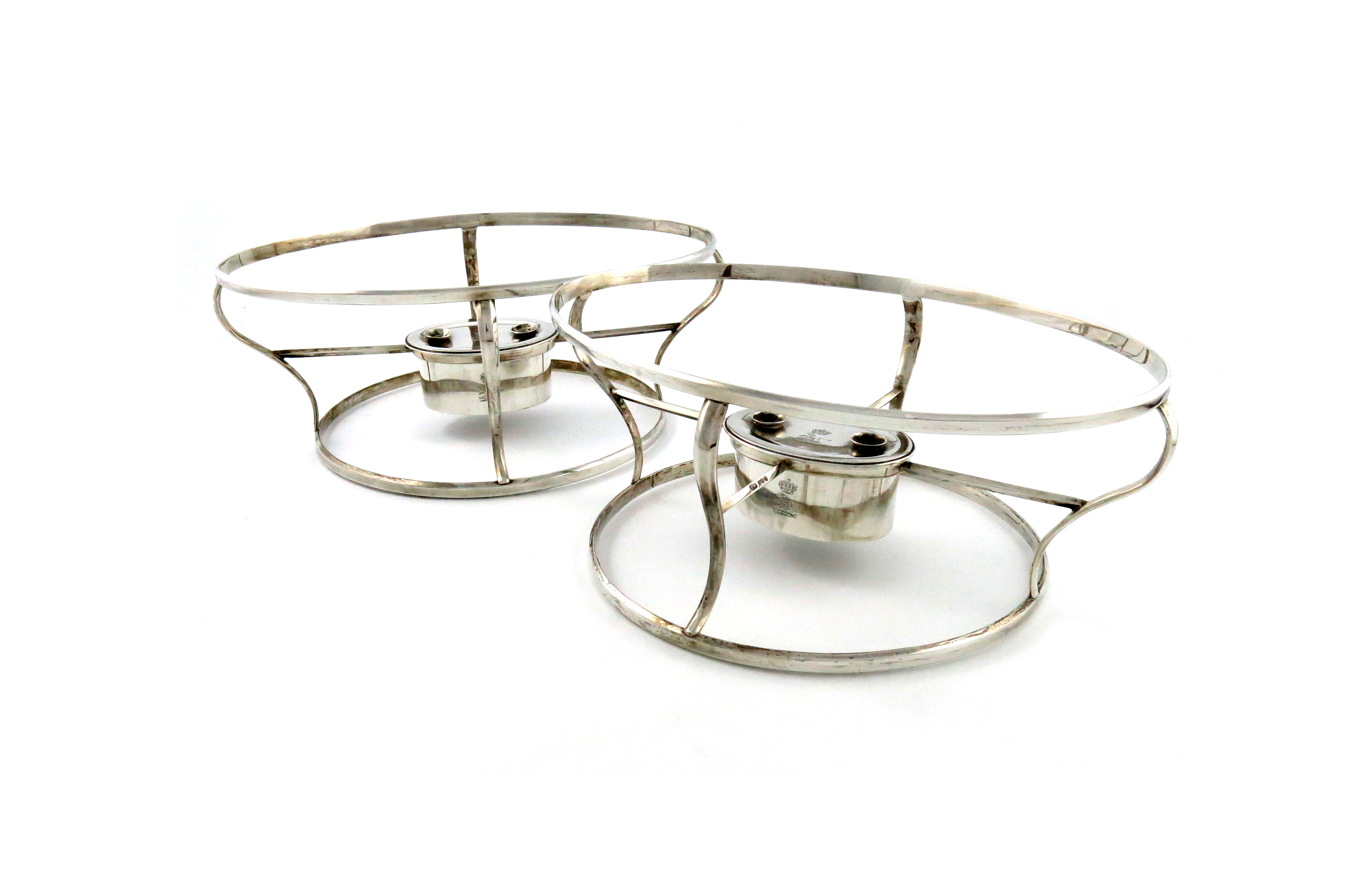 interchangeable oval and circular form, wire-work frames, with oval burners with two wick holders, engraved with a crowned crest, length 31.5cm, approx. weight 50oz. (2)
