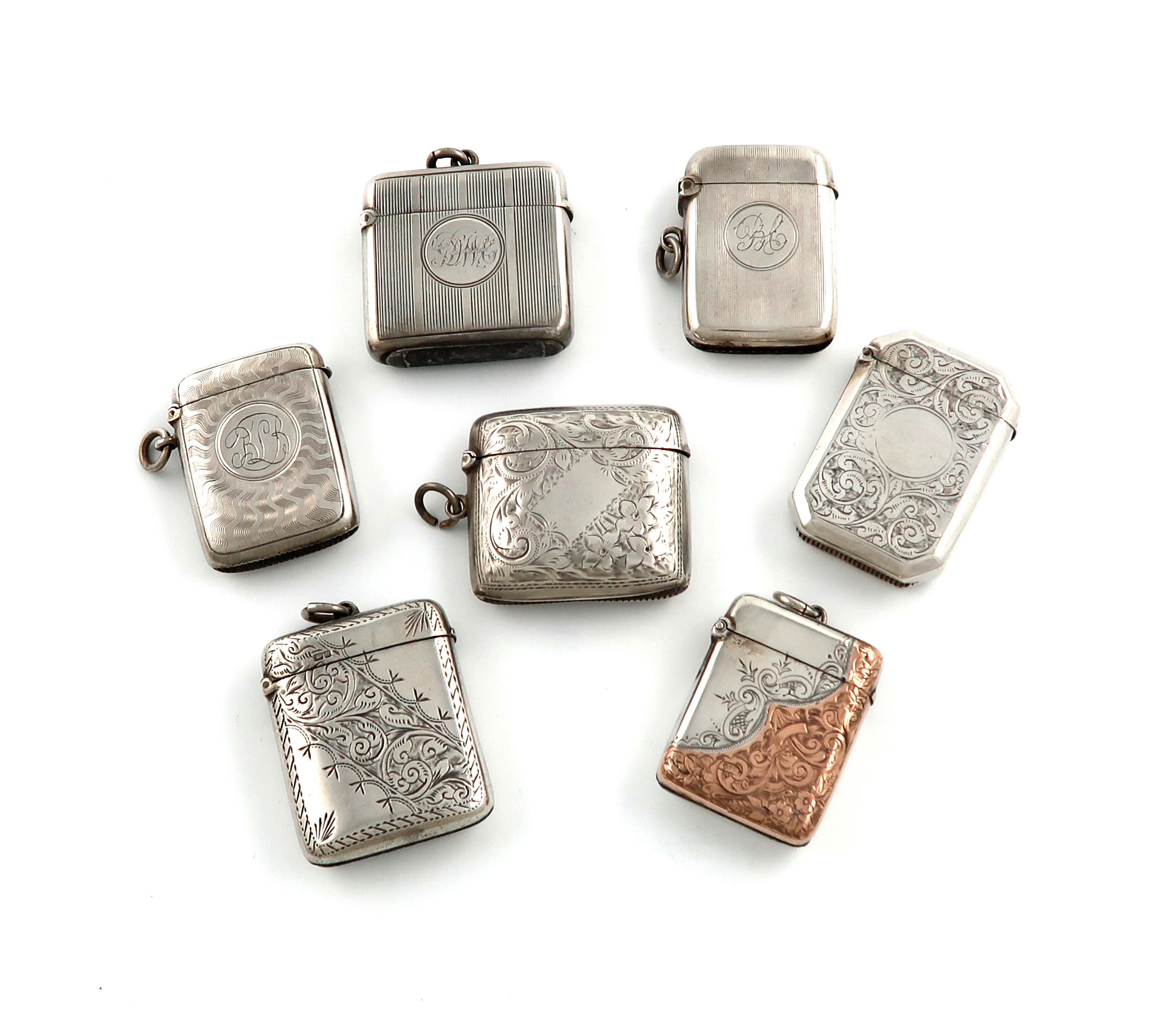 comprising: one by Horace Woodward & Co Ltd., Birmingham 1905, with spiral engine-turned decoration, one applied with a 9 carat gold plaque with engraved foliate scroll decoration, and a ring attachment, the others with foliate scroll and engine-turned decoration, approx. weight 6.3oz. (7)
