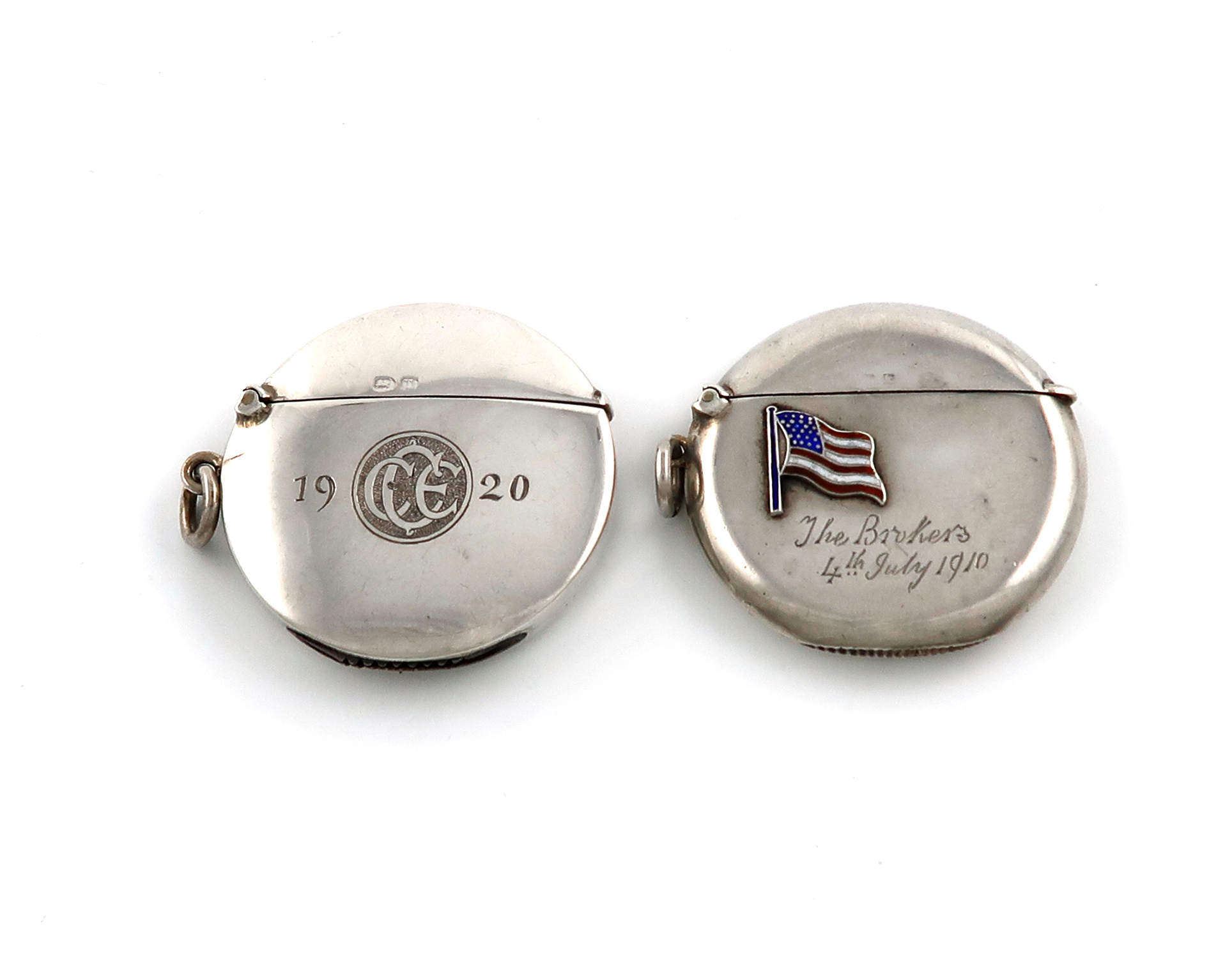circular form, hinged cover with a ring attachment, the front applied with an enamelled stars and stripes flag, and inscribed 'The Brothers 4th July 1910', diameter 4.5cm, plus another circular silver vesta case, Birmingham 1919, the front initialled 'C.C.E', approx. total weight 1.3oz. (2)