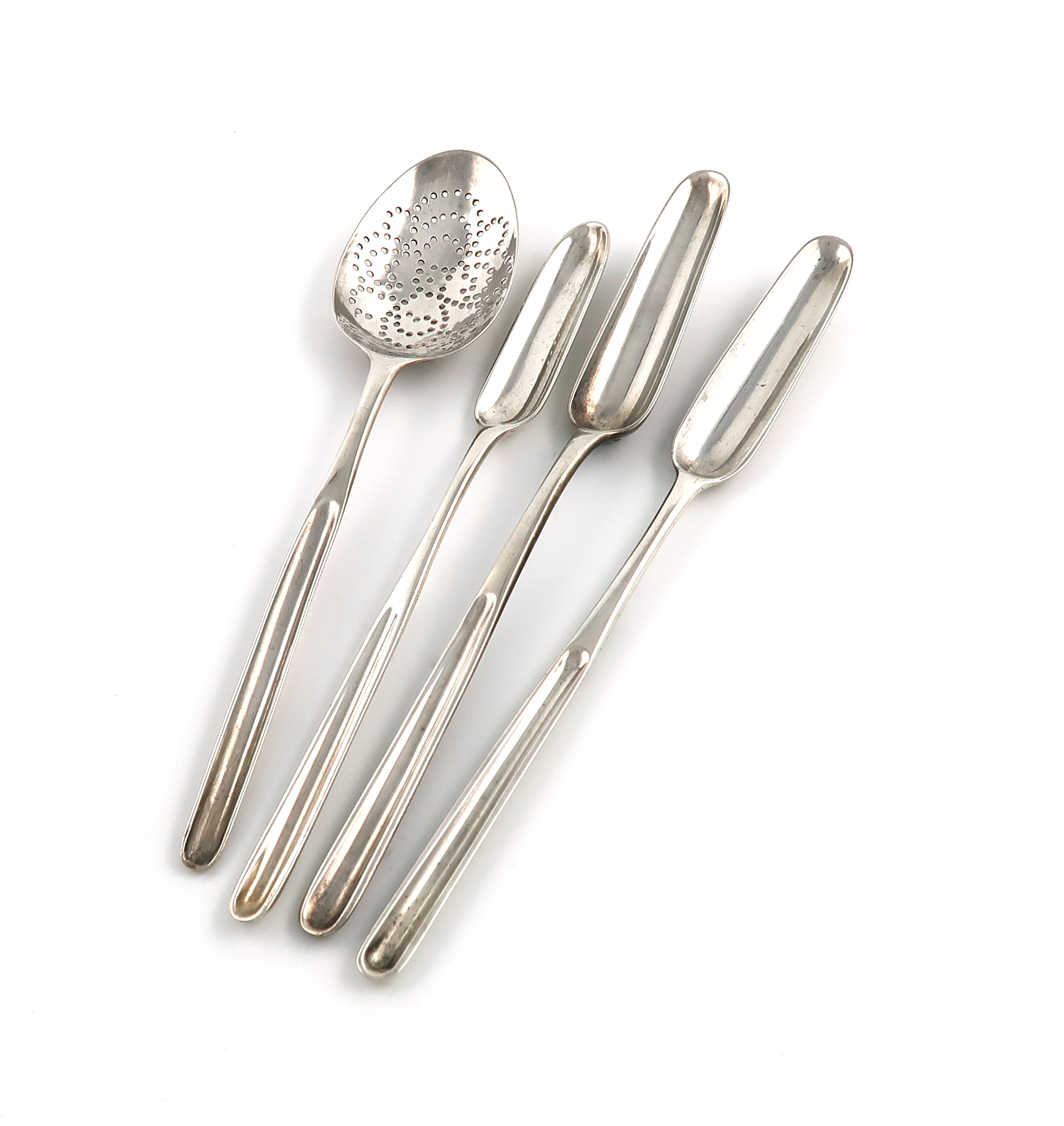 A collection of three antique silver marrow scoops and a marrow spoon,