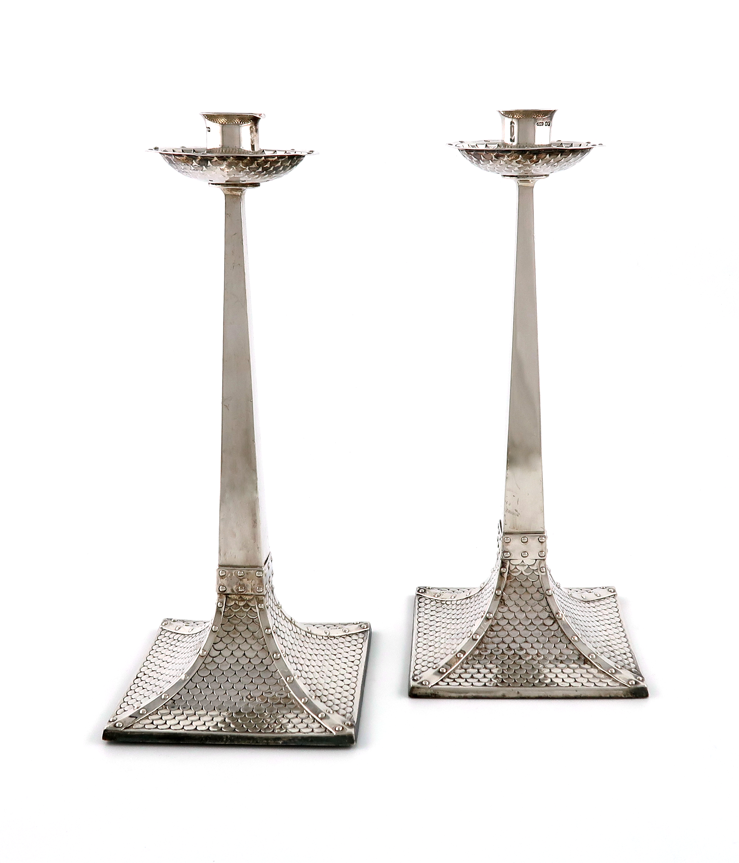 A pair of Edwardian silver Arts and Crafts candlesticks
