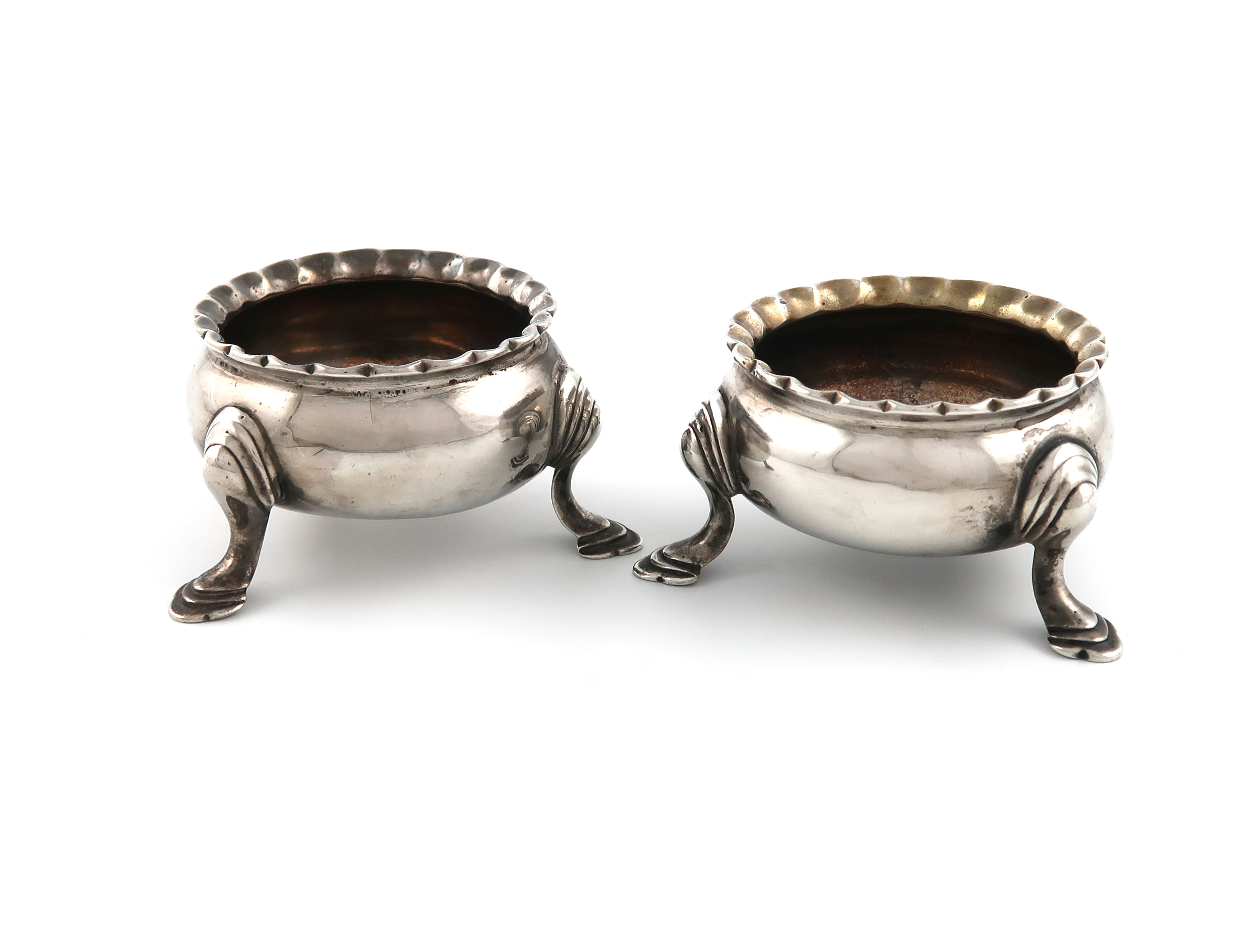 circular form, gilded wavy-edge border, on three hoof feet, diameter 7cm, approx. weight 6.4oz. (2)