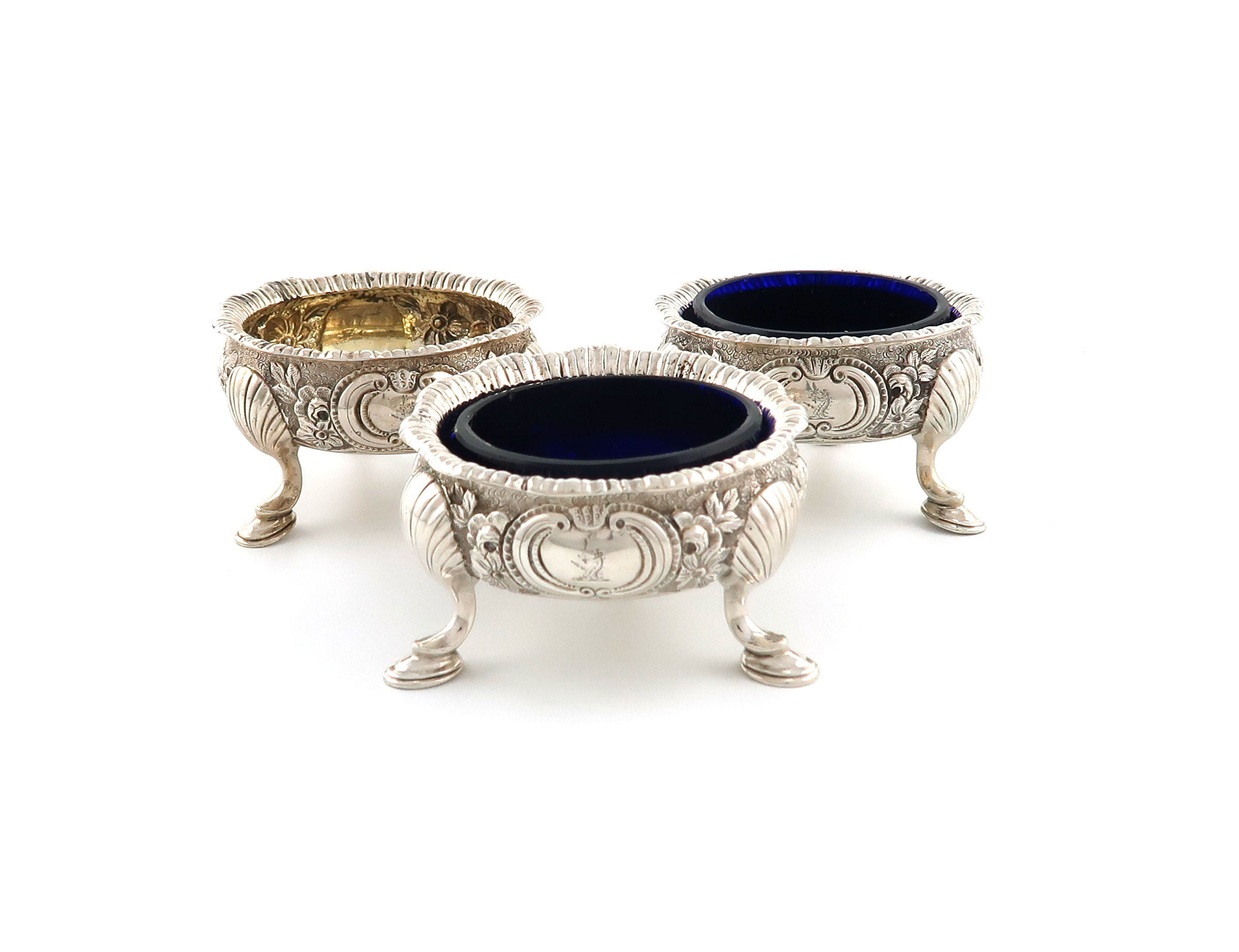 circular form, later chased foliate decoration on a matted background, on three shell capped hoof feet, gilded bowls, two with later plus glass liners, engraved with a crest, diameter 6.5cm, approx. weight 7.5oz. (3)