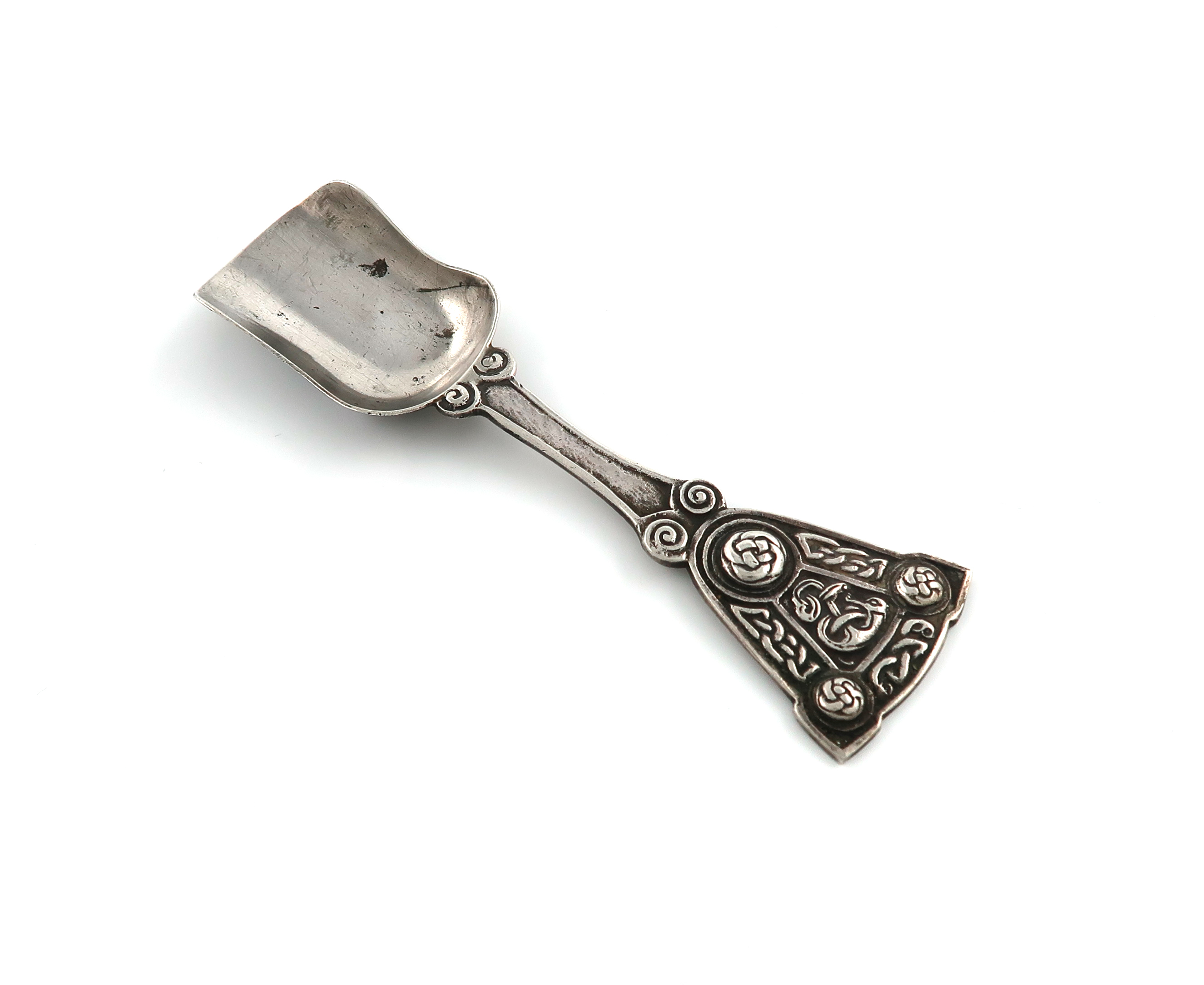 shovel shaped bowl, the tapering handle with Celtic knot decoration, length 12.2cm, approx. weight 1oz.