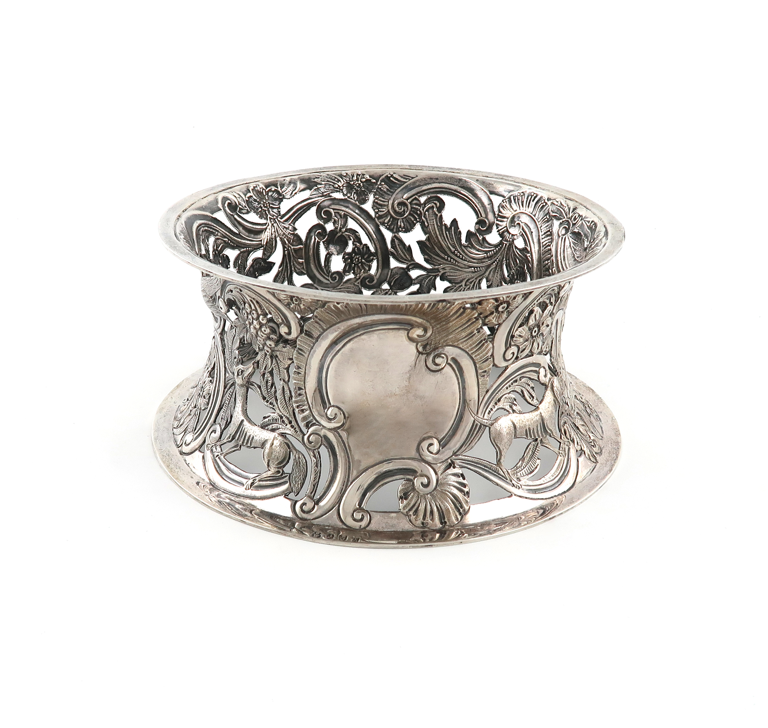 circular tapering form, pierced and embossed with animals, birds and foliate scroll decoration, with a vacant cartouche, diameter of base 20.8cm, approx. weight 12.9oz.