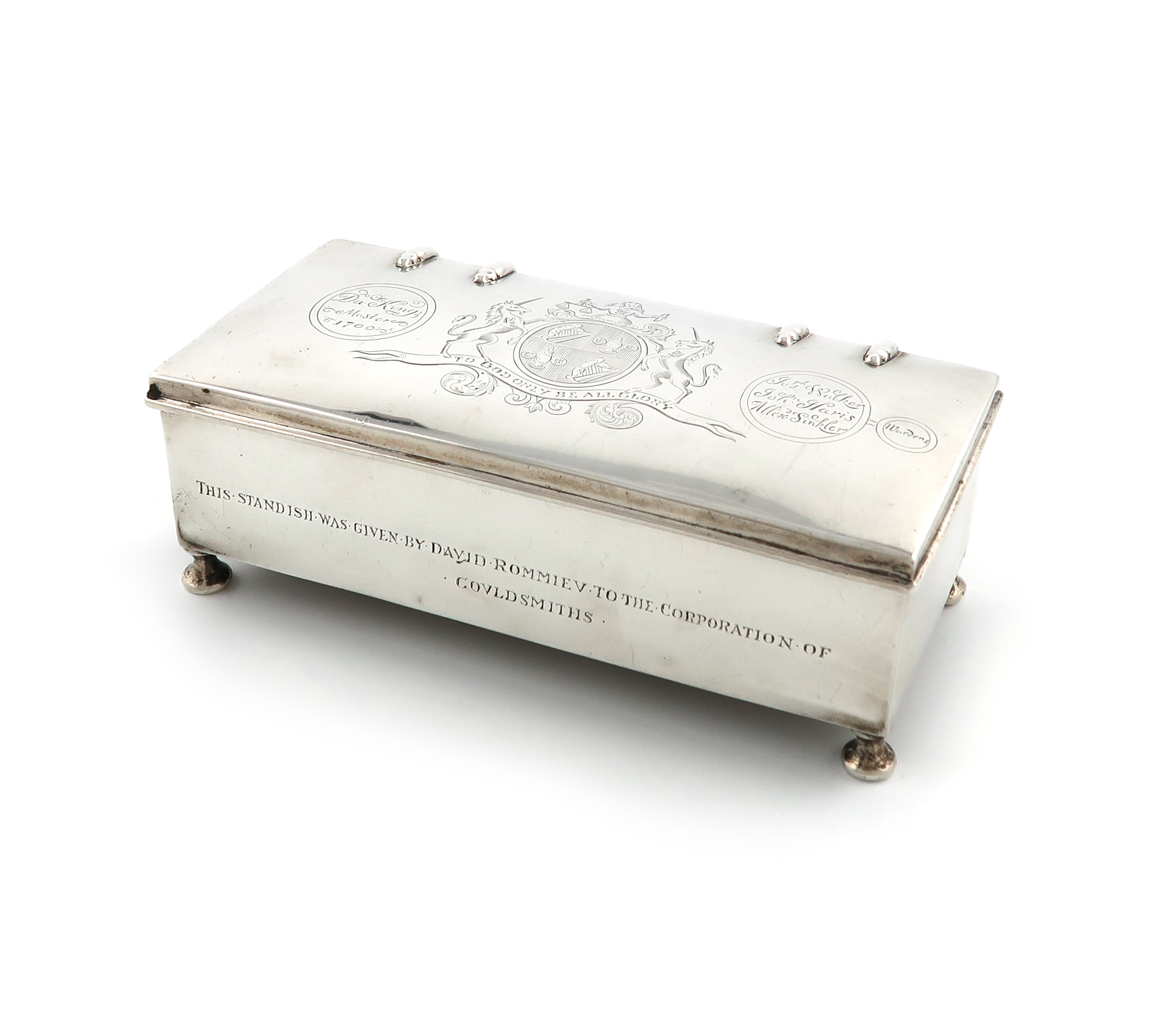 rectangular form, the hinged cover engraved with the Corporation arms and inscribed with the name of the Master and Wardens in 1700, the front inscribed 'This Standish was given by David Rommiev to the Corporation of Goldsmiths', wooden base, on four pad feet, length 19.5cm,