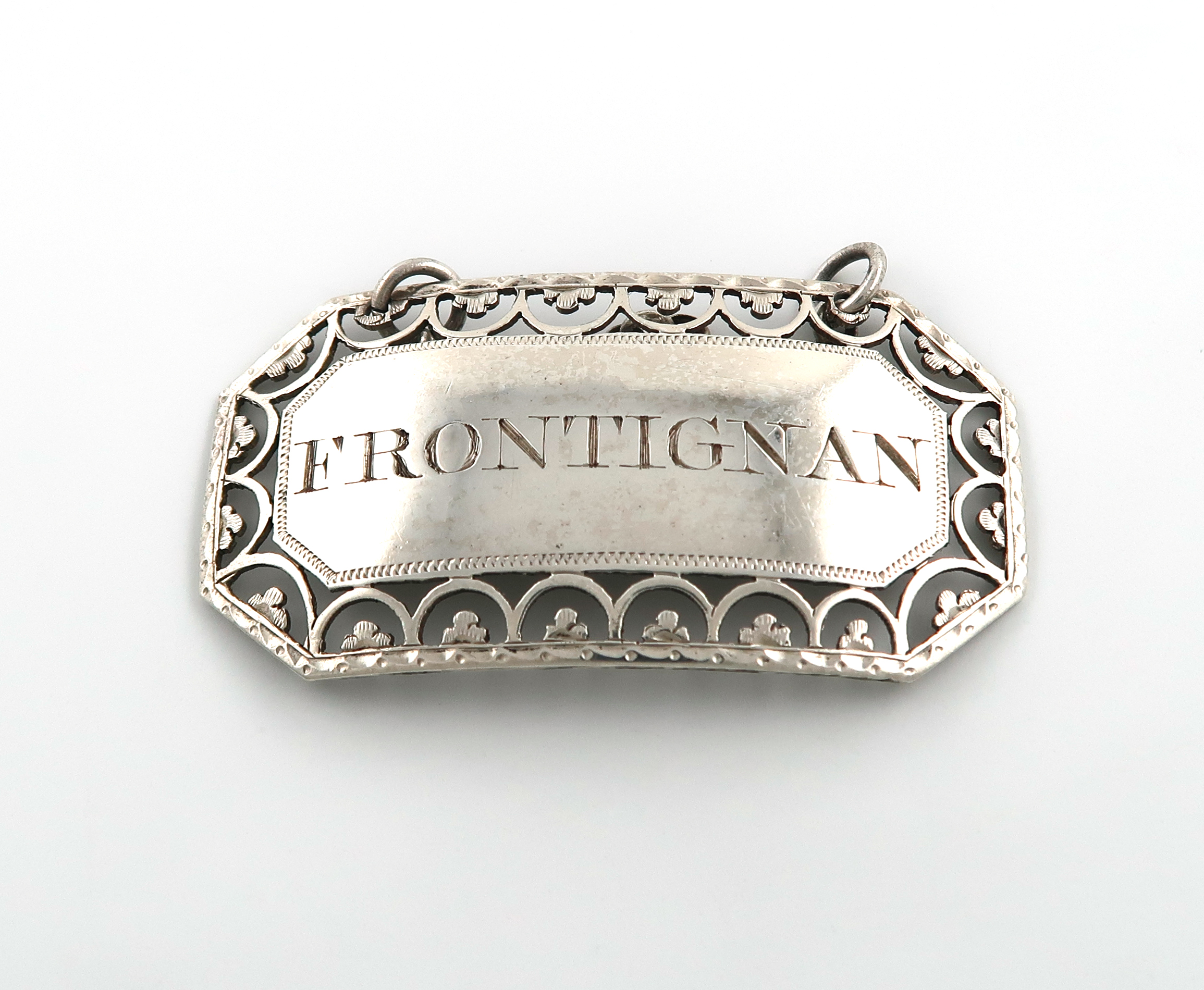 rectangular form, canted corners, pierced hoop and trefoil border, incised 'FRONTIGNAN', length 4.8cm, approx. weight 0.27oz