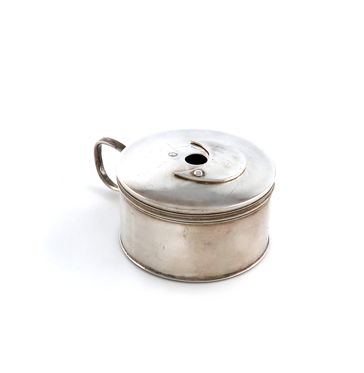 circular form, hinged side ring handle, the pull-off cover with a cutter, diameter 4.5cm, approx. weight 1.2oz.