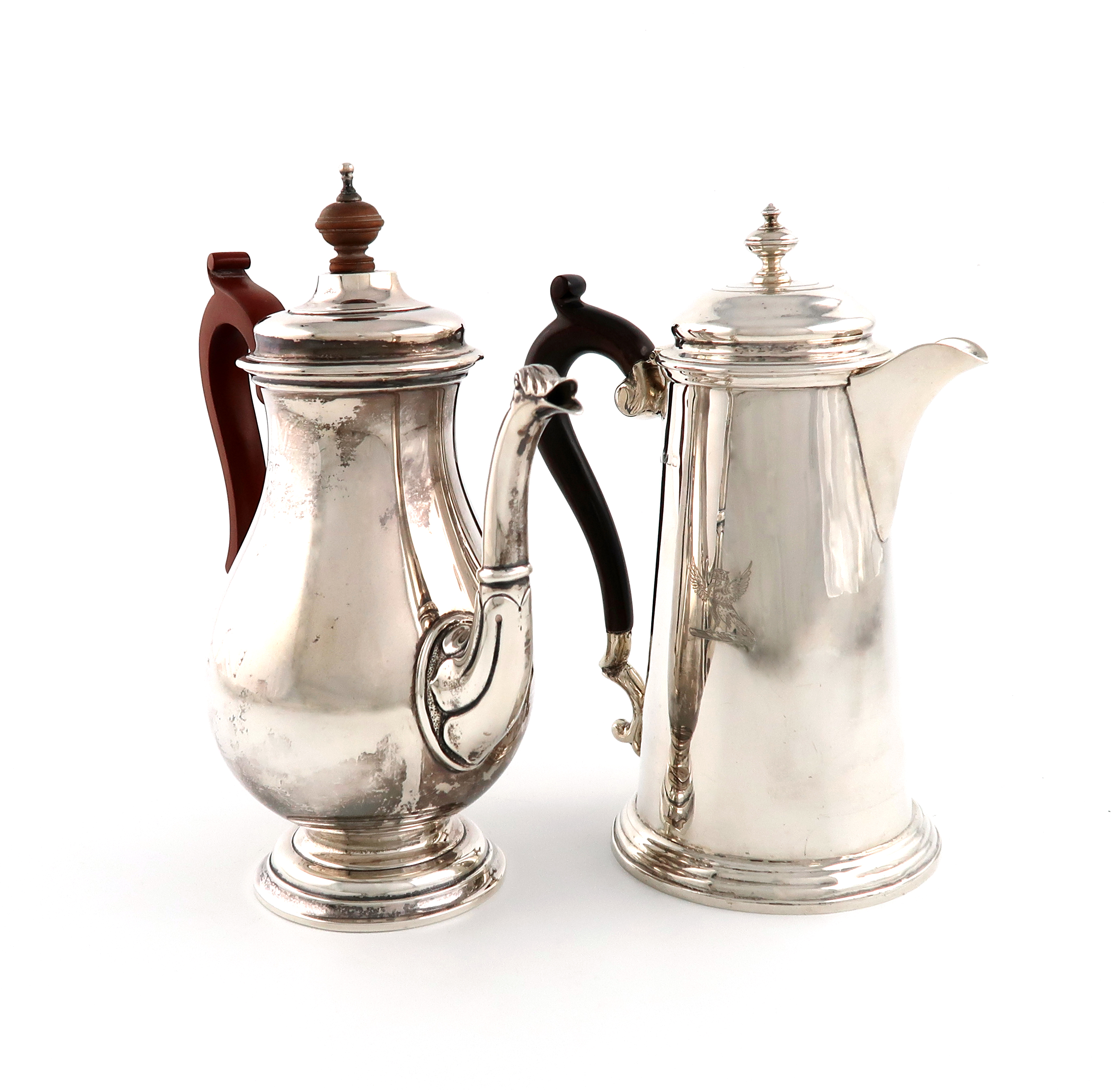 baluster form, scroll handle, on a circular foot, height 21.5cm, plus a silver hot water pot, by Martin, Hall and Company, date letter worn, tapering circular form, engraved with a crest, approx. total weight 25.5oz. (2)