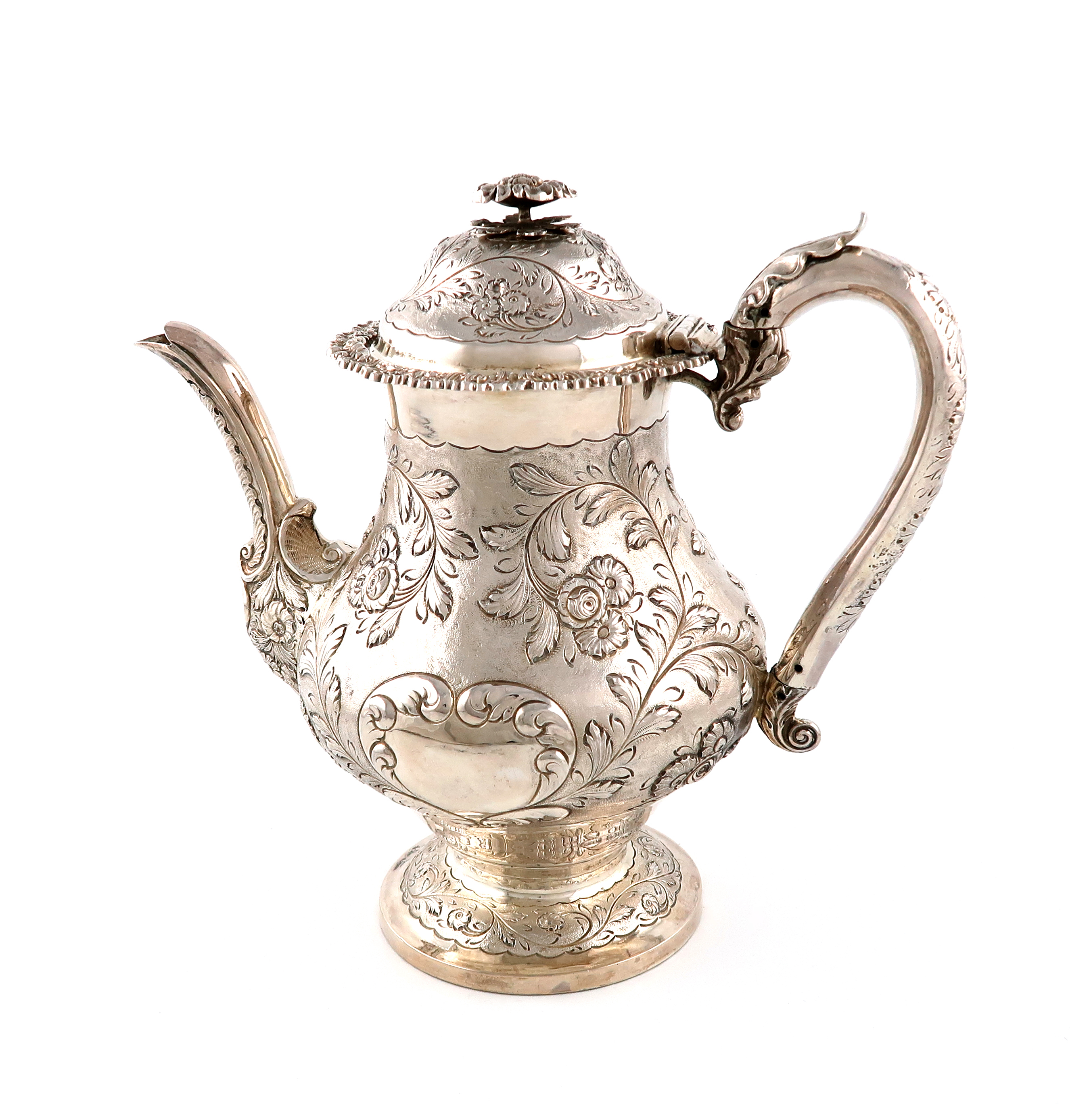 baluster form, with embossed and chased foliate decoration, on a matted background, domed hinged cover, flower finial, on a raised circular base, scroll handle (detached), height 24cm, approx. weight 32oz.