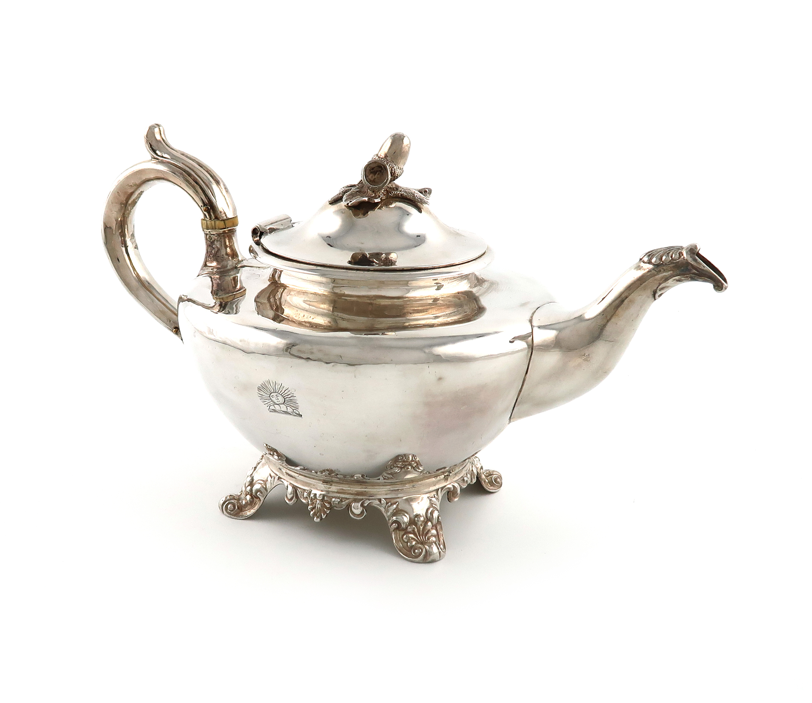 tapering circular form, scroll handle with ivory insulators, raised hinge cover with an acorn finial, on four scroll feet, with a crest, length handle to spout 28cm, approx. weight 22.5oz.