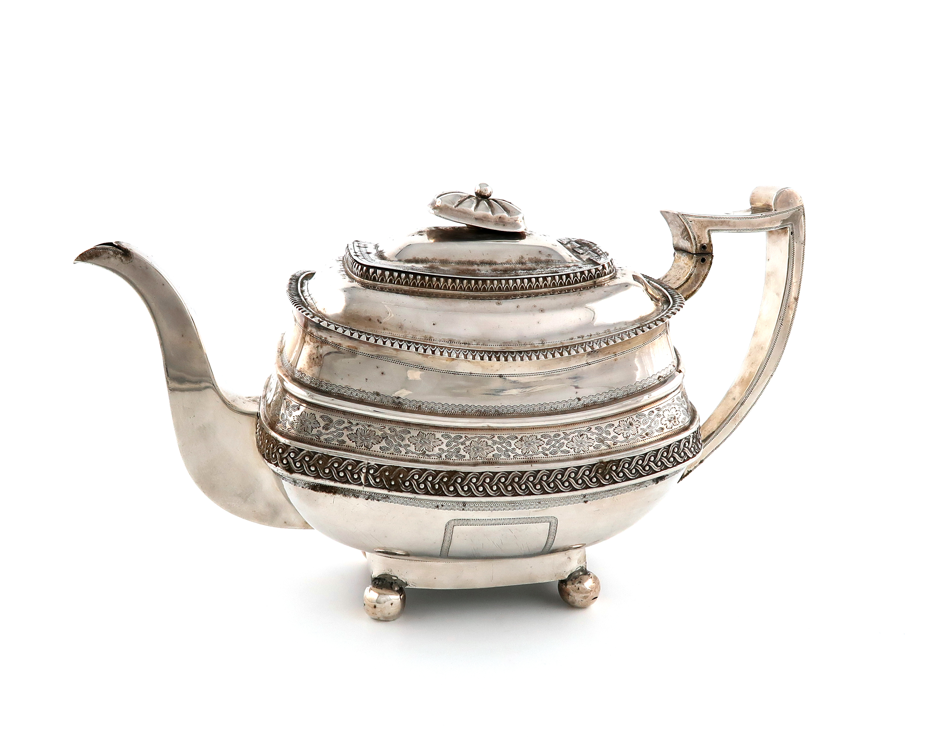 rounded oblong form, chased foliate and scroll decoration, raised hinged cover, on four ball feet, scroll handle (detached), length handle to spout 29cm, approx. weight 22.7oz.