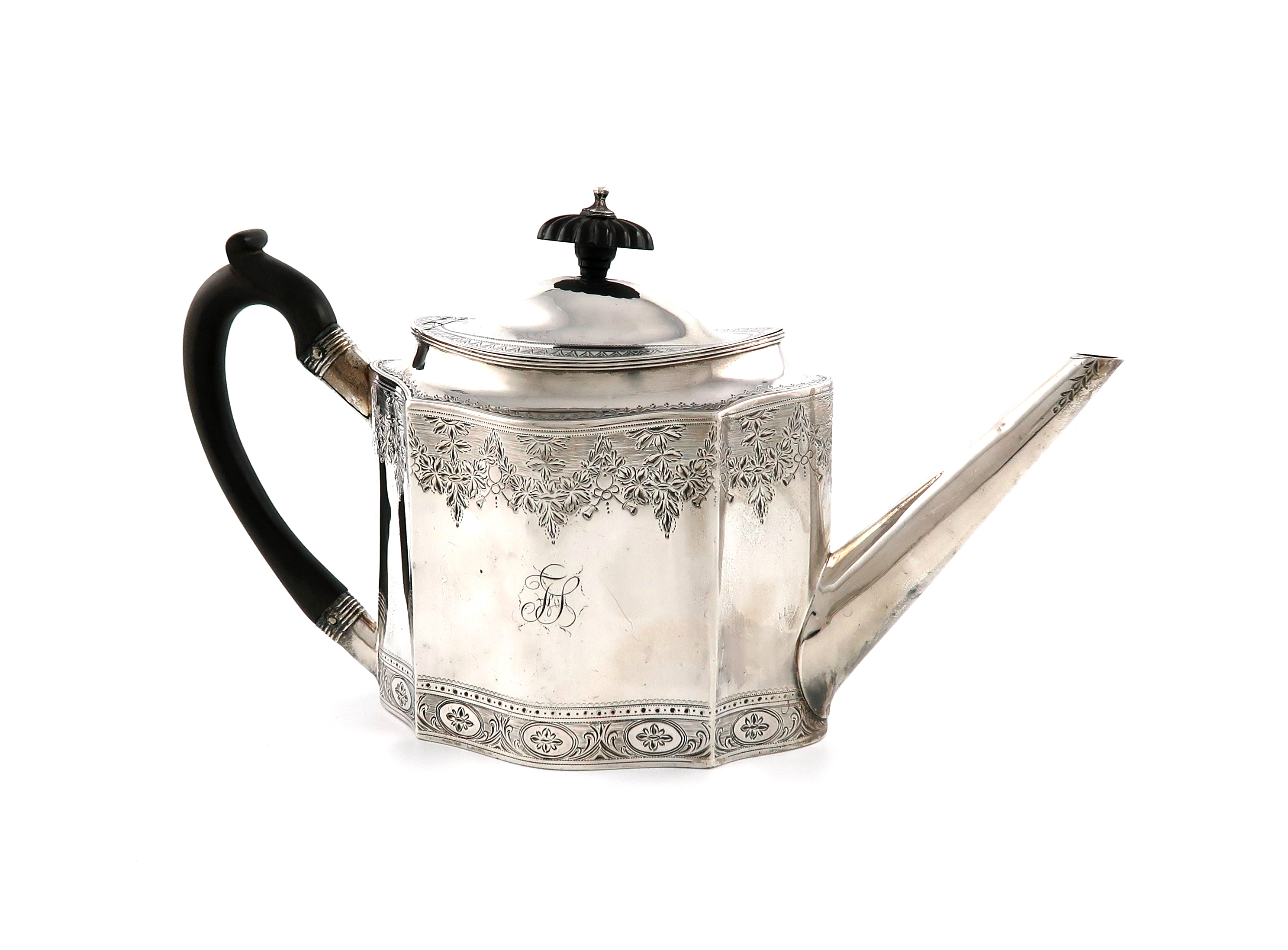 shaped oval form, tapering spout, scroll handle, flush-hinged cover, engraved decoration, initialled, length handle to spout 29.3cm, approx. weight 15.6oz.