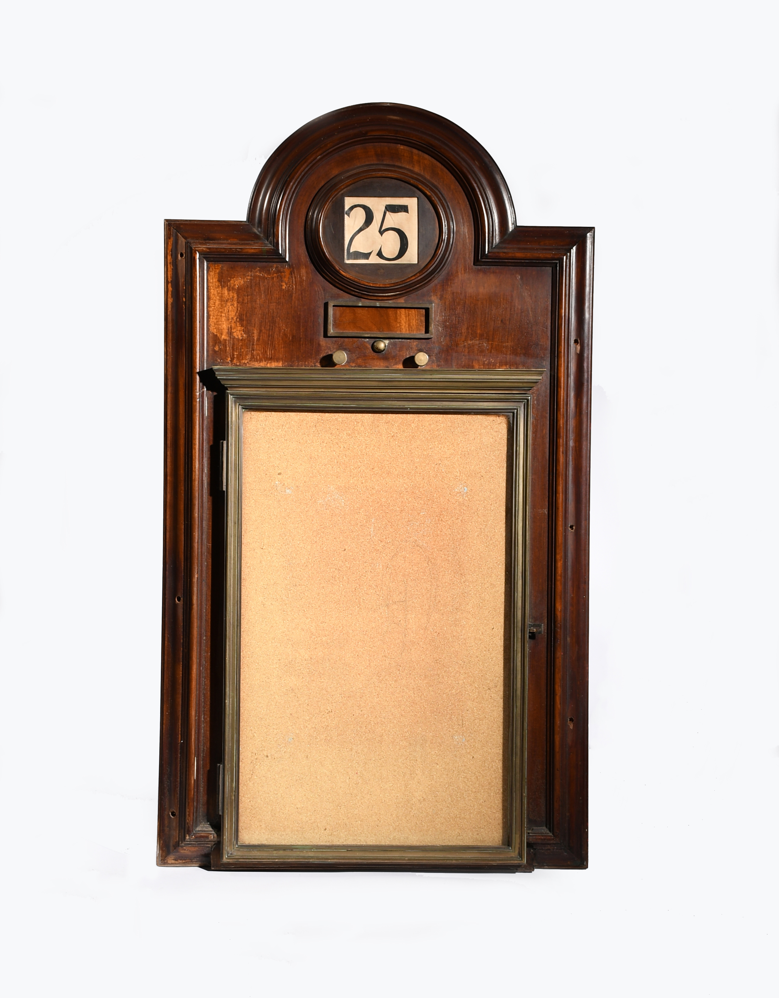 A mahogany wall calendar and notice board in the manner of C F A Voysey, rectangular with domed top, set with heavy brass shallow cabinet with hinged door for notices, below circular calendar unsigned, 121cm. high, 68cm wide.