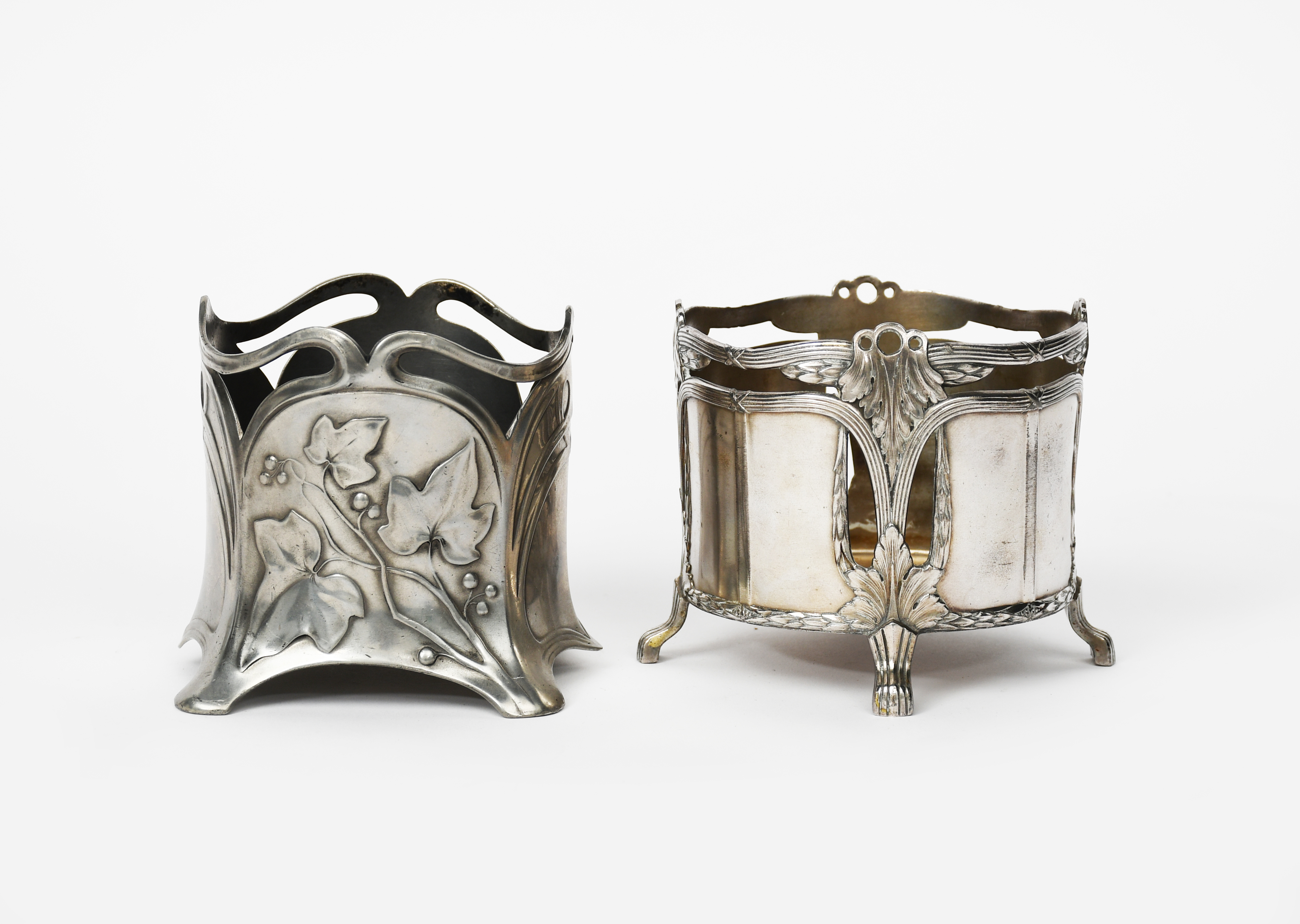 An Art Nouveau WMF pewter wine bottle coaster, model no.358, cast in low relief with berried foliage panels, and another electroplated wine coaster stamped factory marks, 9.5cm. high (2)