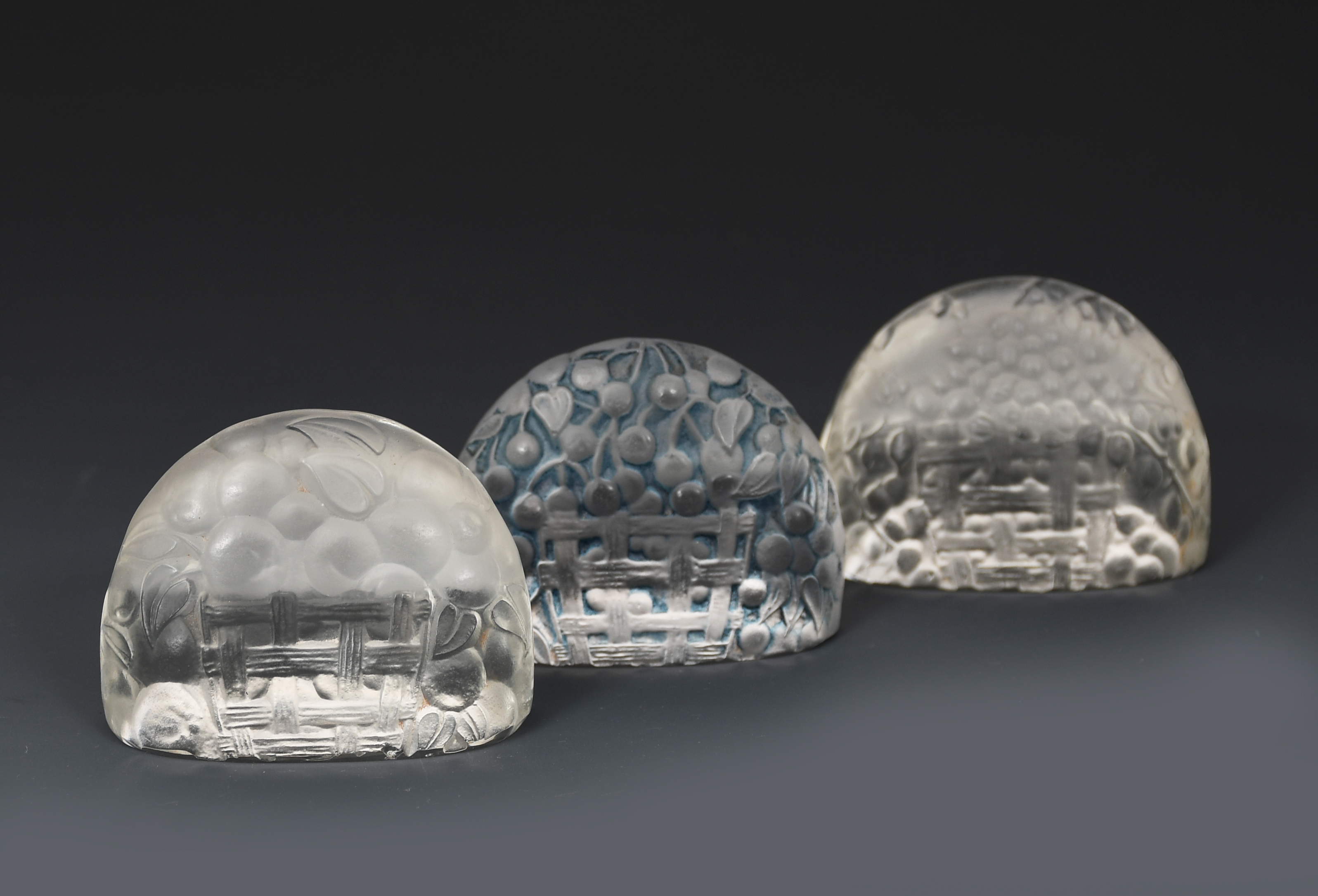 'Cerises' a Lalique clear and frosted glass menu holder designed by Rene Lalique, with blue staining, a Lalique 'Groseilles' menu holder and a Lalique 'Prunes' menu holder model no.3509, etched R Lalique, 5.2cm. wide (3)