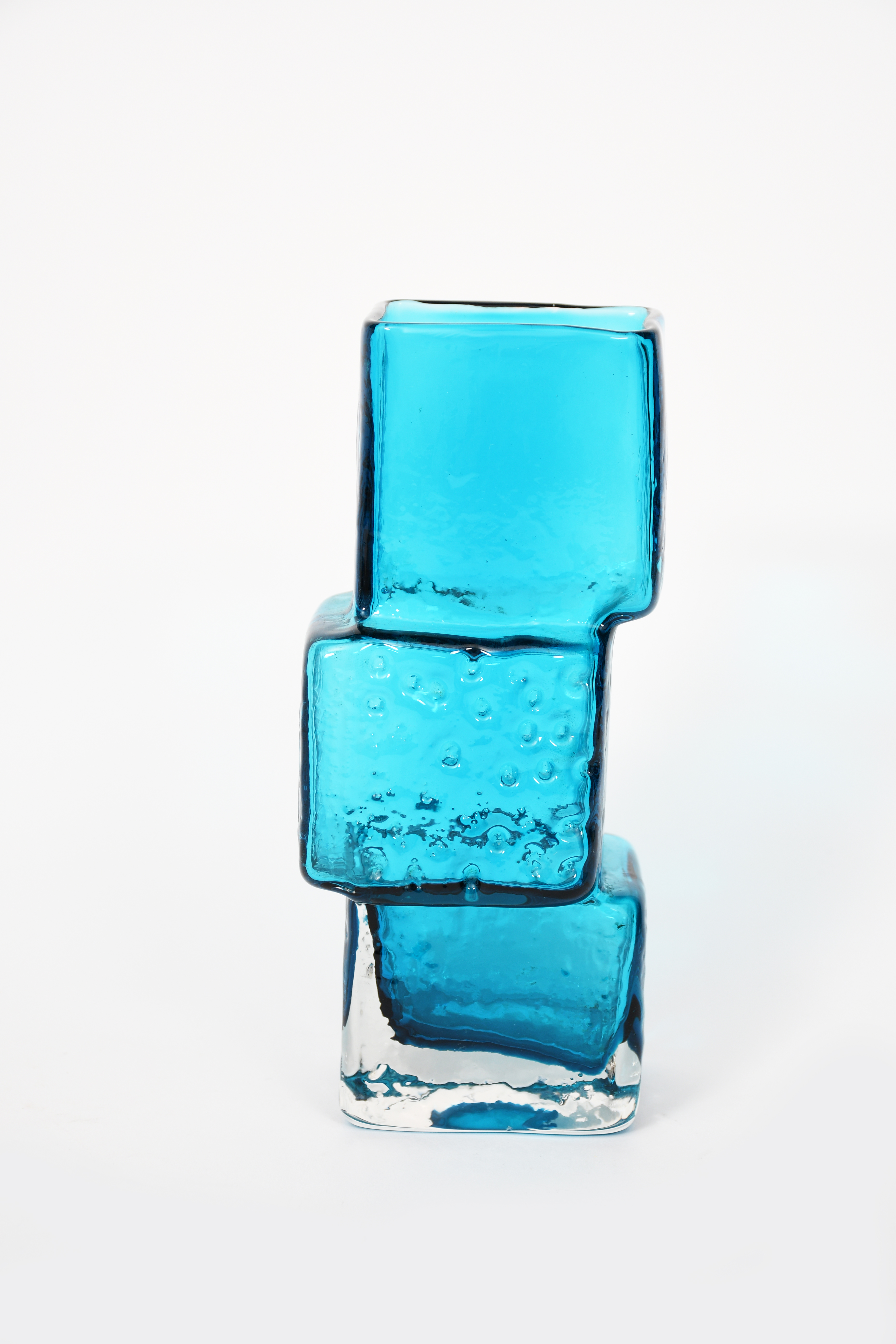 A Whitefriars Kingfisher Blue Drunken Bricklayer vase designed by Geoffrey Baxter, textured blue glass unsigned, 20.5cm. high