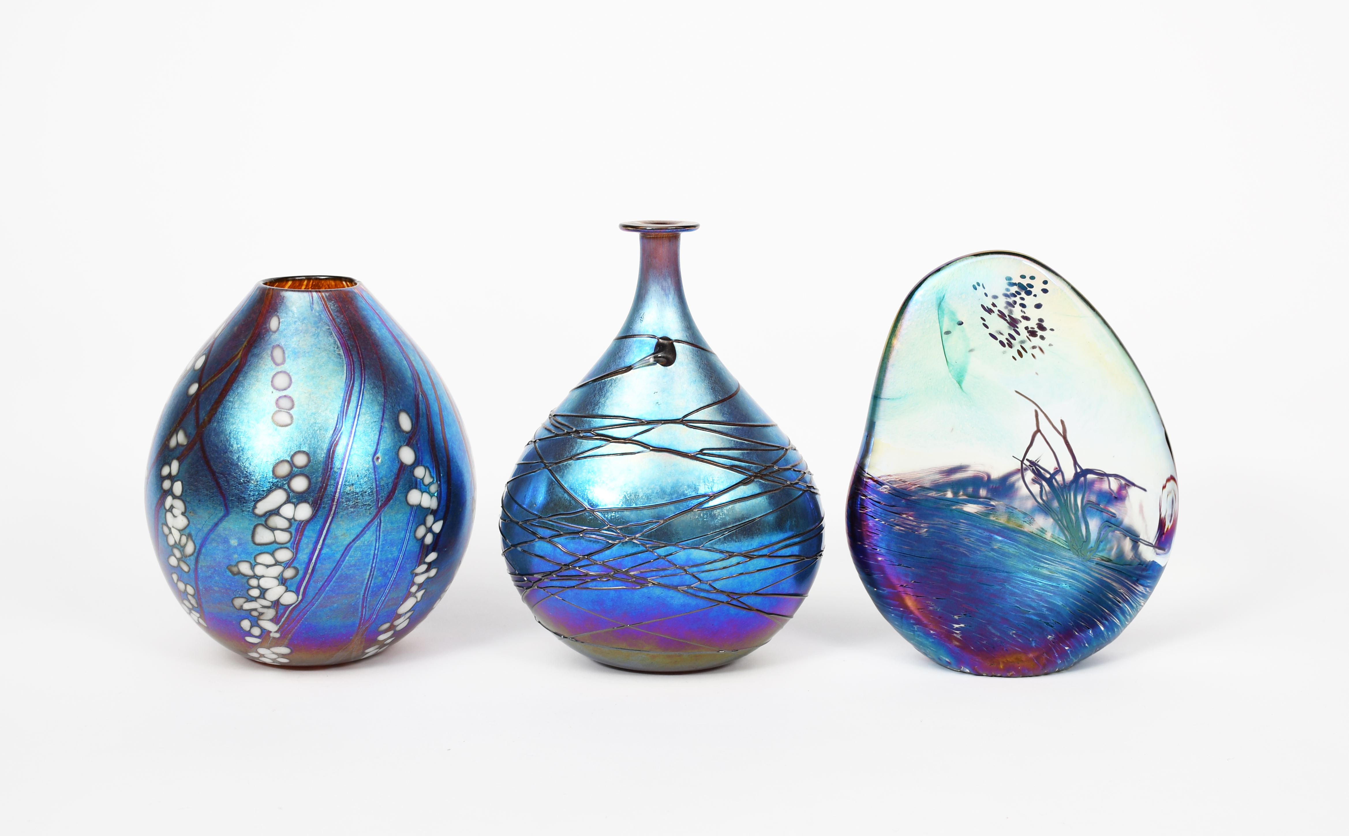 a lustred glass solifleur flask, dated 2000, tapering ovoid form with flaring rim, applied trailing, another Siddy Langley ovoid vase with columns of white spots and a John Ditchfield pebble vase, etched marks, 21.5cm. high (3)