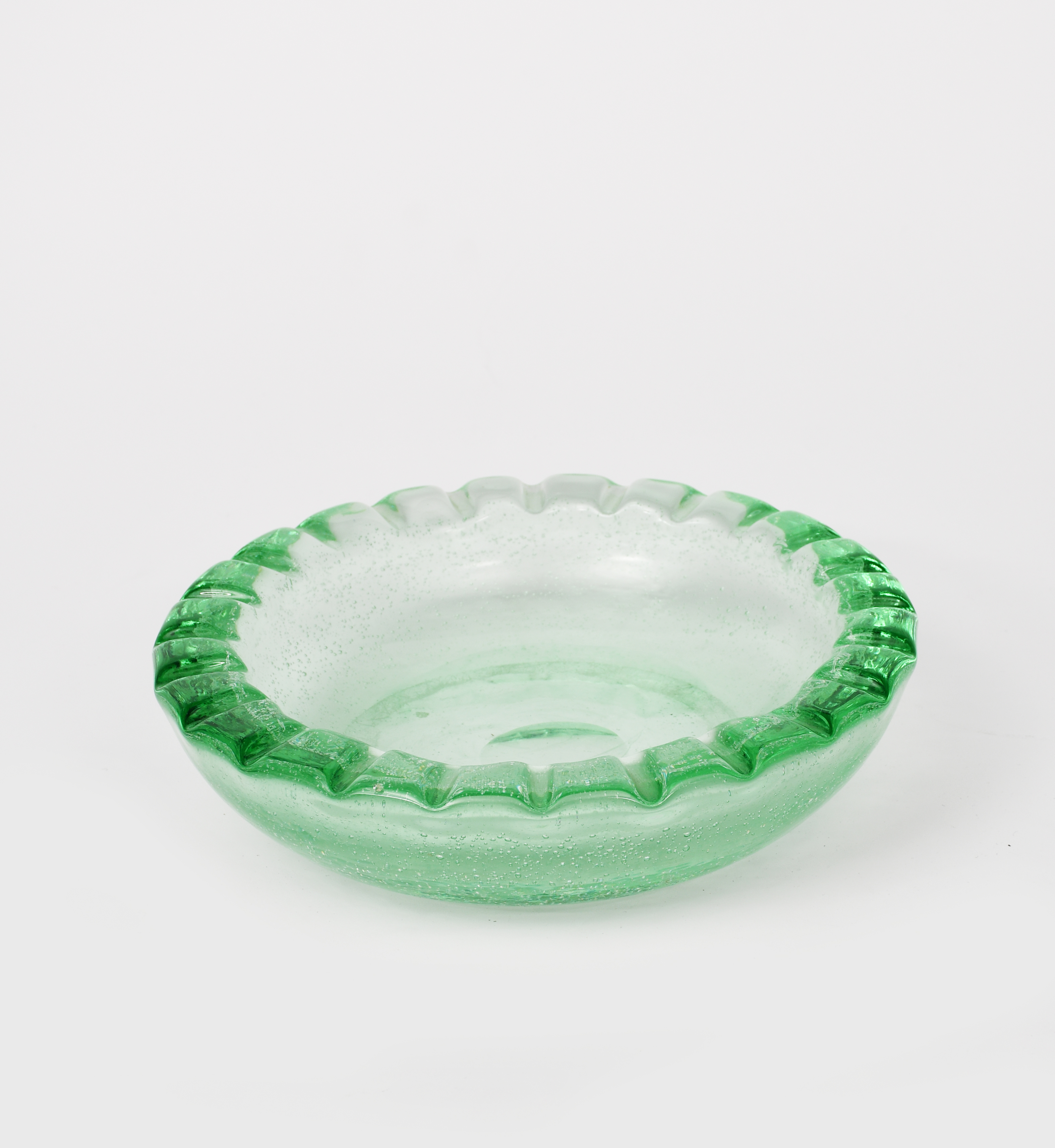 A Daum Nancy glass bowl, circular with fluted rim, pale green glass internally decorated with air bubbles, etched Daum Nancy France to base rim, 25.5cm. diam.