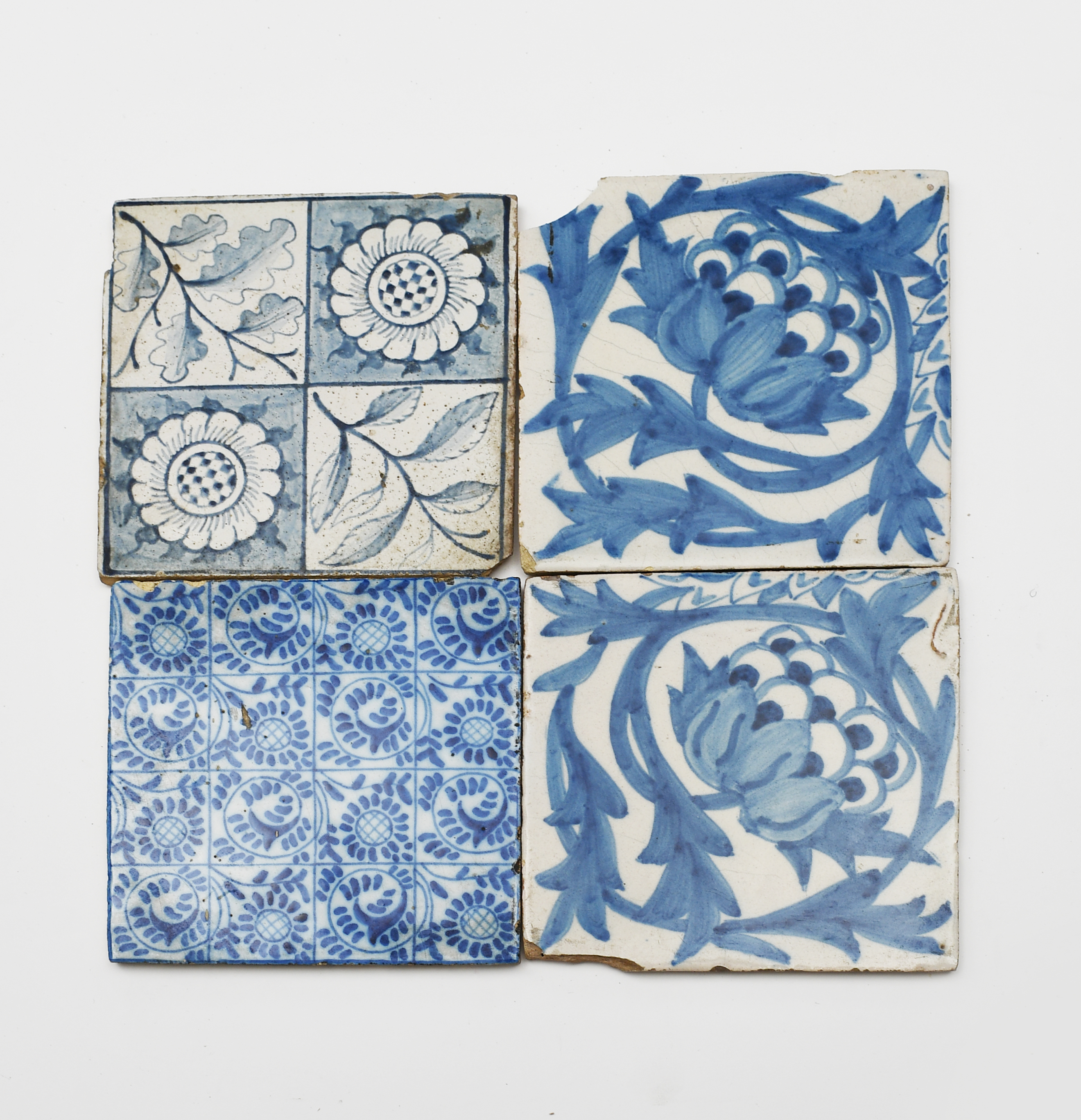 A Morris & Co Longden tin-glazed tile, painted with alternating flowers and foliage stems, in blue on a white ground, a 'Scroll' tile and two 'Artichoke' tiles unsigned, minor losses, 13cm. square (4)