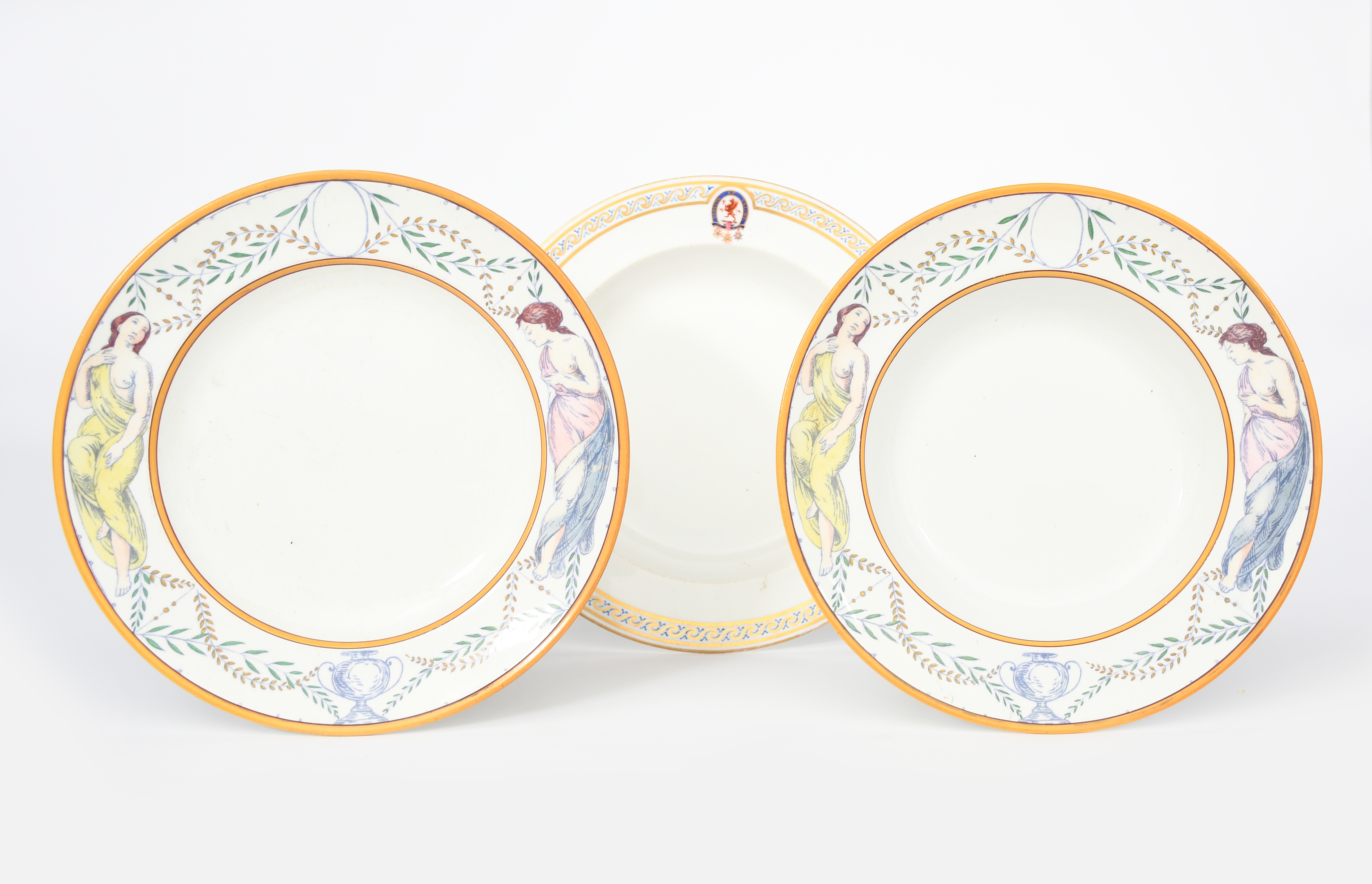 A pair of Wedgwood plates designed by Emile Lessore, printed to the rim with two classical females, in colours, and a Barnicott & Banfield 'Sydenham Crystal Palace soup bowl, printed with a coat of arms, impressed factory marks, 26cm. diam, (3)