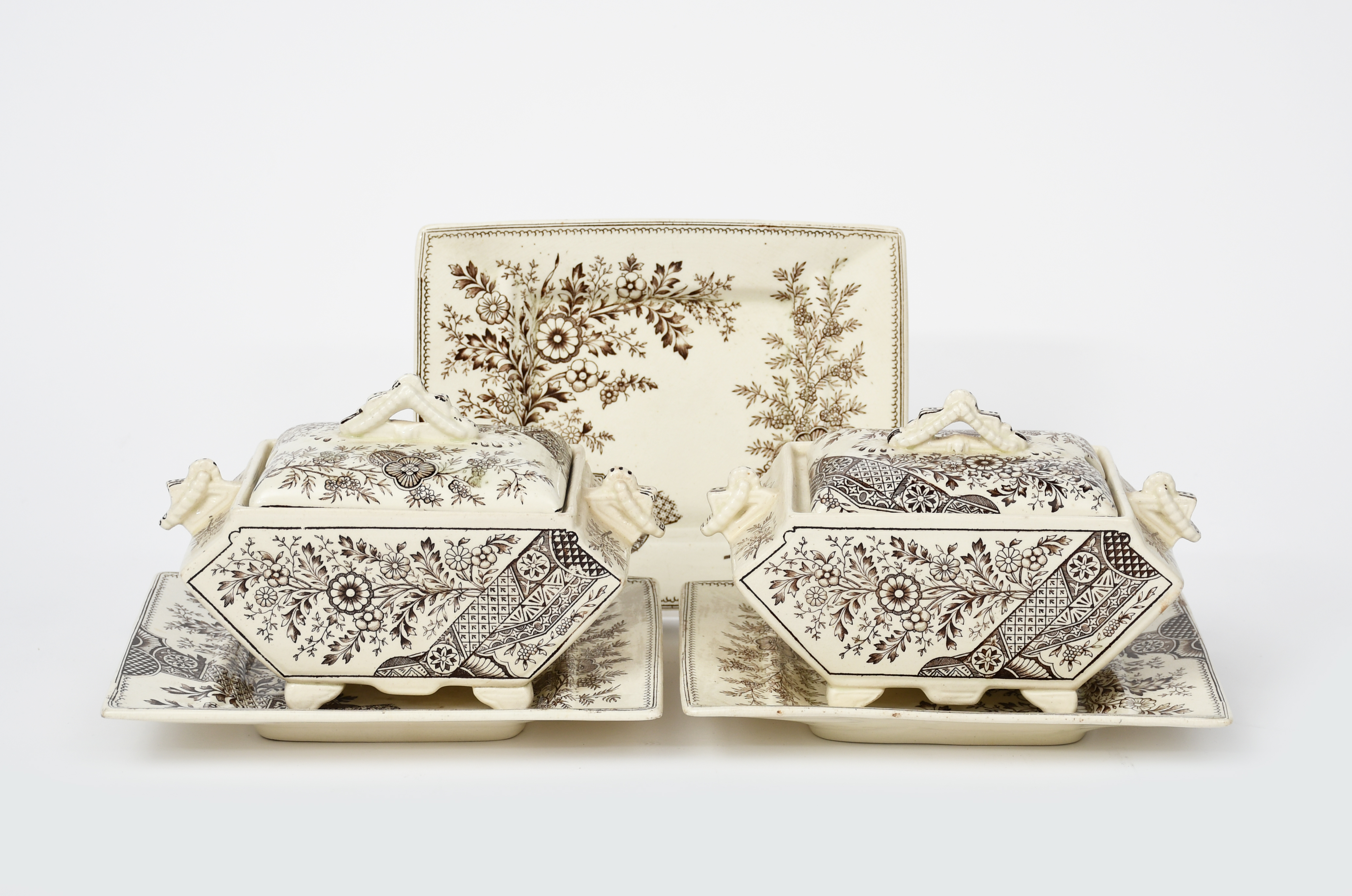A pair of Old Hall Hampden small tureens designed by Dr Christopher Dresser, printed in brown with Japoniste foliate designs, comprising; two tureens, covers and three saucers, various marks, 20.8cm wide (saucers), (7)