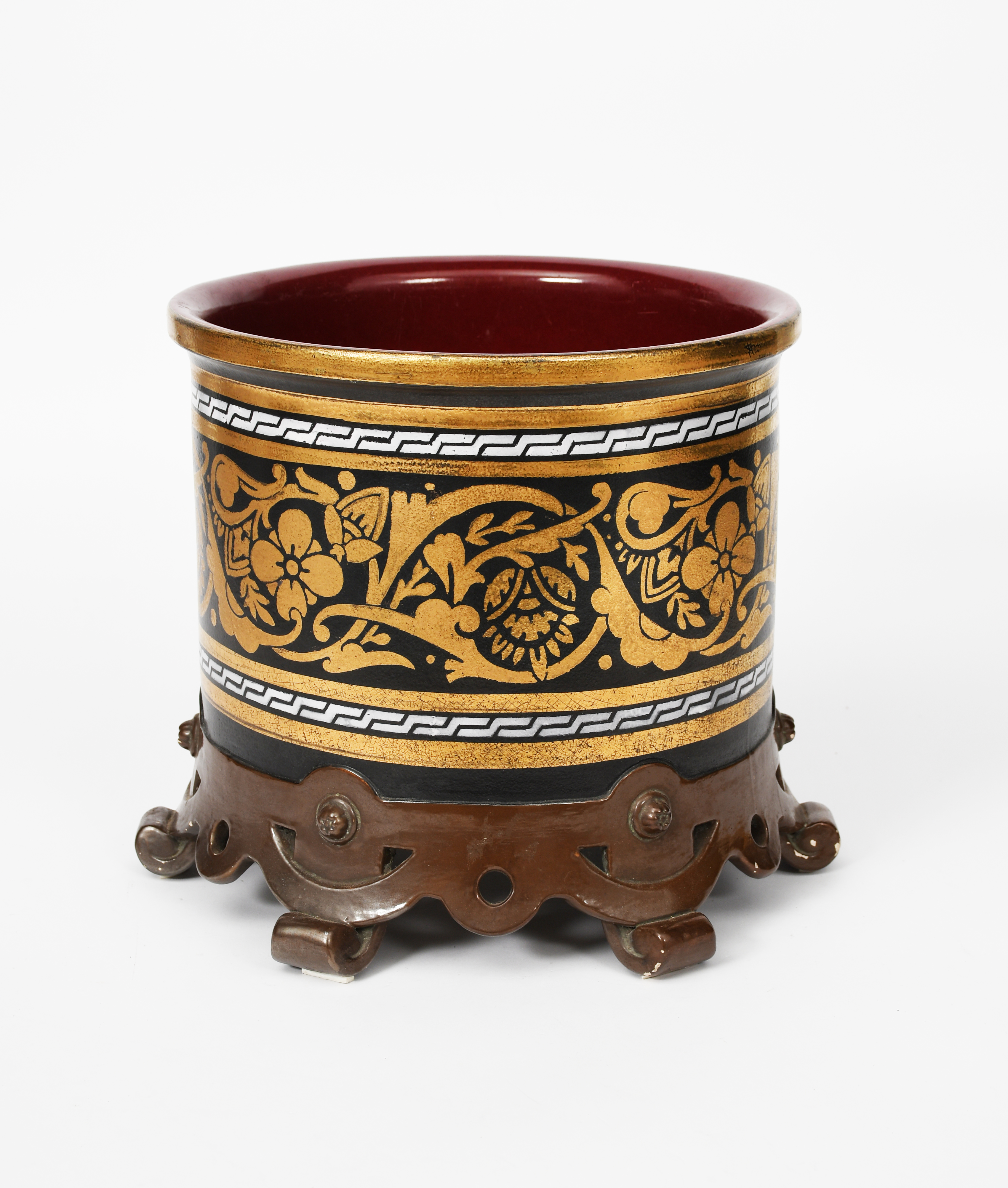 A large Bretby Pottery jardiniere in the manner of Dr Christopher Dresser, drum form, on flaring foot, printed with stylised scrolling foliate design, in gilt on a black ground stamped marks, crack to foot, 31.5cm. high