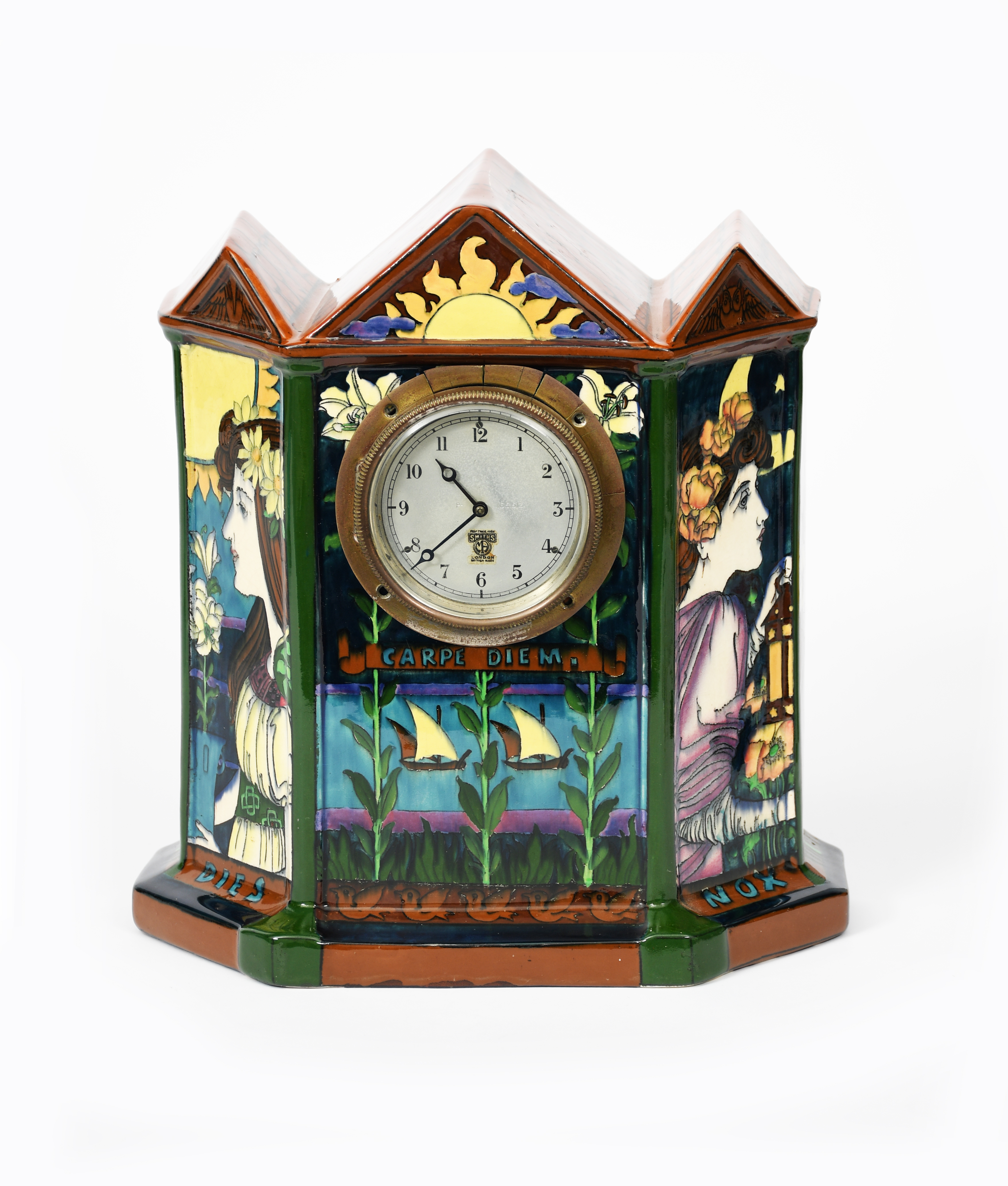 A Foley Wileman Intarsio Mantel clock designed by Frederick Rhead, model no.3160, the central panel with ships sailing behind white lilies, titled Carpe Diem, flanked by classical maidens depicting night and day, under pitched mantel, in colours, with Smith's circular metal dial printed factory mark, 28.5cm. high