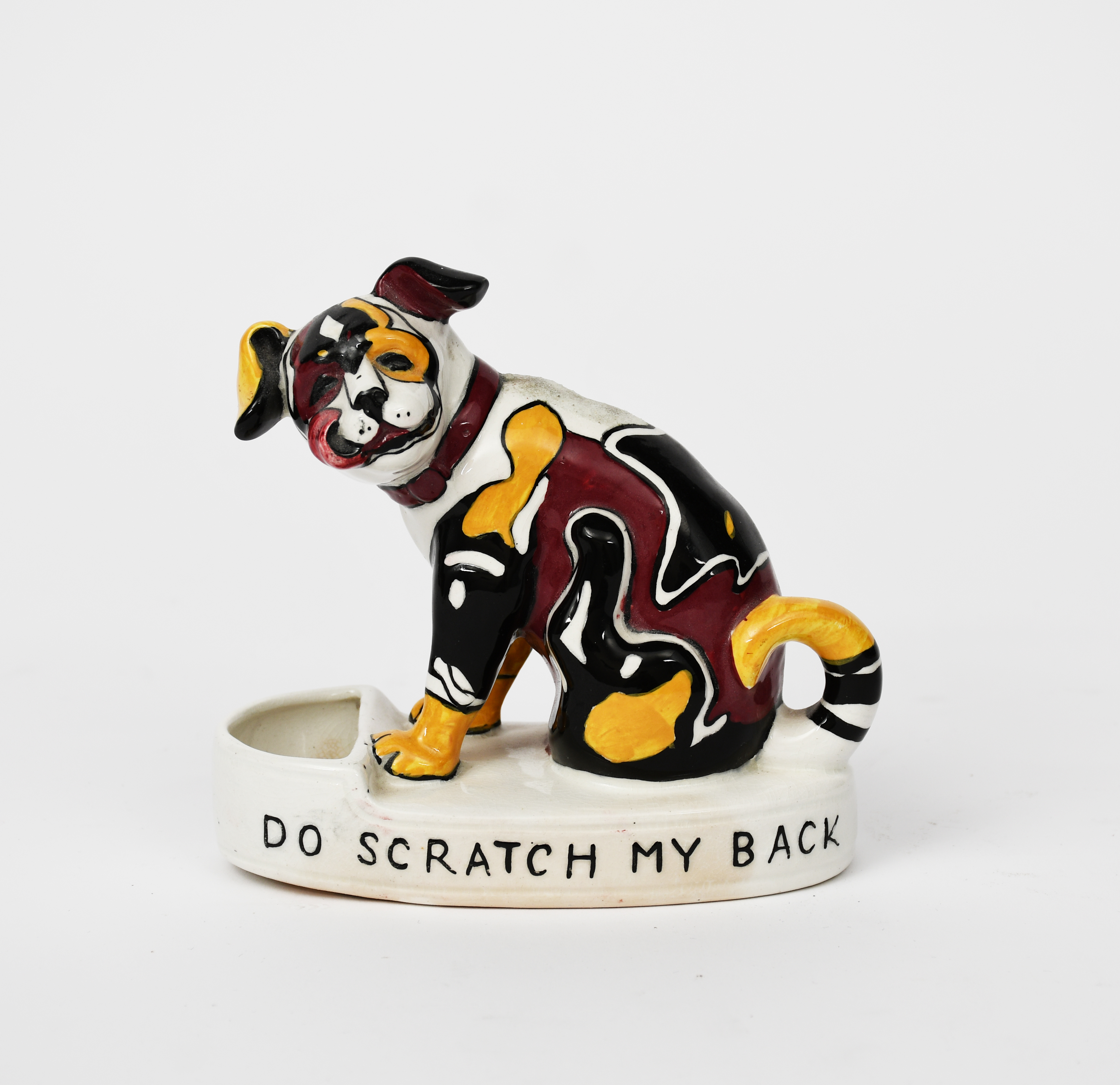 'Do Scratch my Back' a Wilkinson's Pottery vesta, modelled as a dog, seated with tongue out, painted in shades of yellow, red and black, the oval base inscribed Do scratch my back, retailed by Soane & Smith, London, stamped factory mark, 12cm wide, 12cm high